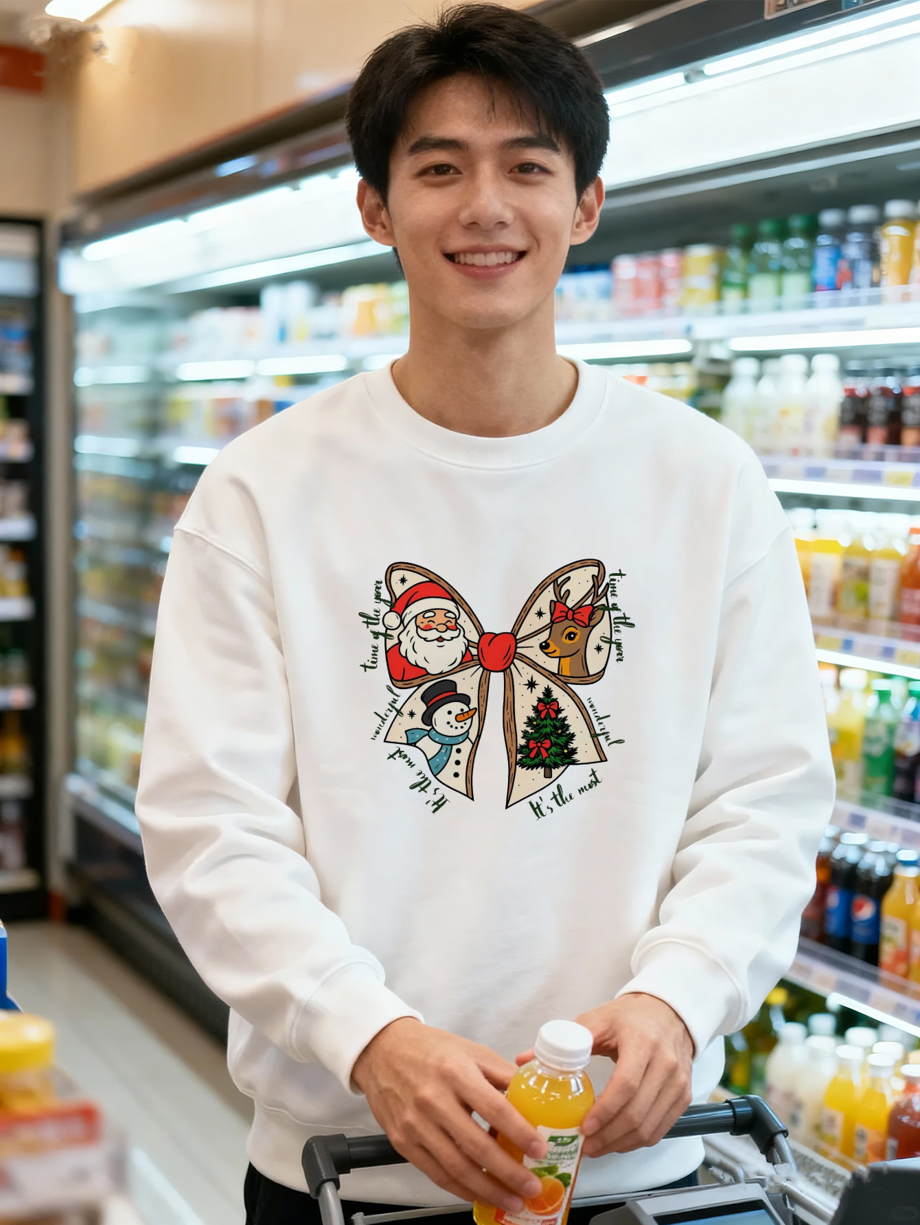 このホワイトのクリスマススウェットシャツは、ホリデーシーズンを盛り上げる楽しいデザインが特徴です。大きなリボンの中に、サンタクロース、トナカイ、雪だるま、クリスマスツリーなどの愛らしいキャラクターが描かれており、温かみのあるホリデー気分を演出します。長袖のプルオーバータイプで、寒い季節にぴったりの快適な着心地を提供します。クリスマスパーティーや家族の集まり、カジュアルな外出など、さまざまなシーンで活躍するアイテムです。ホワイトのベースカラーは清潔感があり、どんなボトムスとも合わせやすく、コーディネートの幅が広がります。クリスマスシーズンの特別な装いとして、また大切な方へのギフトとしてもおすすめです。ホリデーテーマのデザインが、あなたのクリスマスをより楽しく、思い出深いものにしてくれるでしょう。