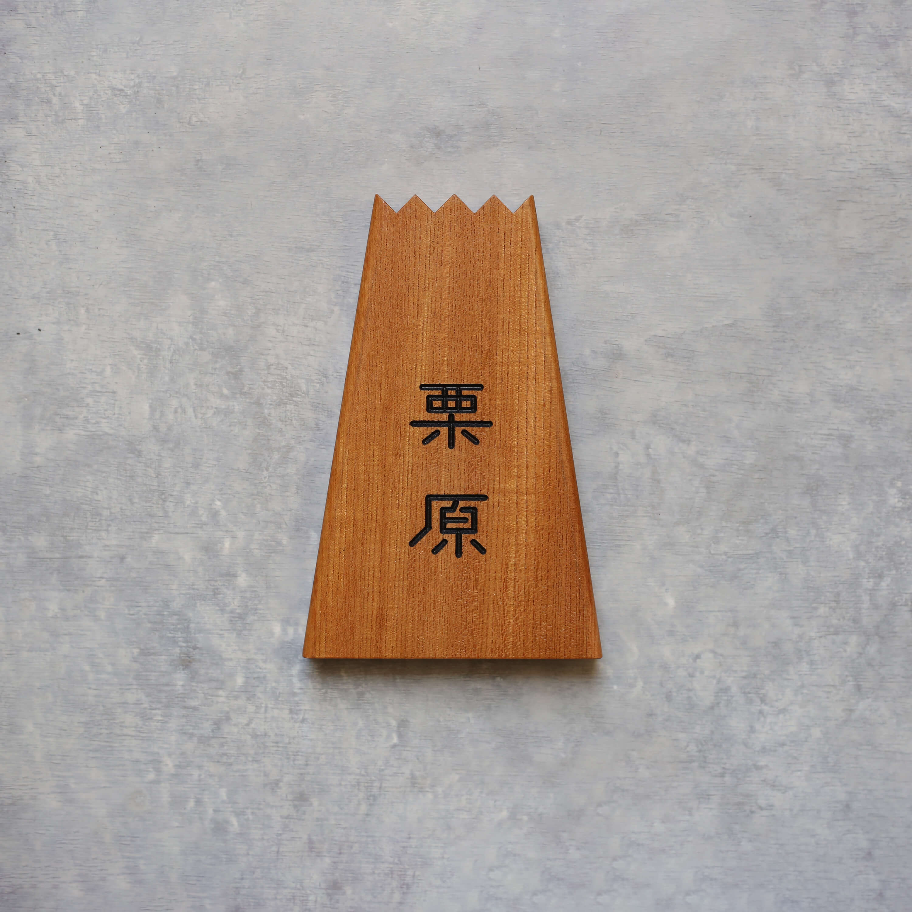 当店の表札は、ガラス塗料で仕上げを行っております。透明感のある仕上がりで、風合・質感を損なわずに仕上がります。経年による色落ちはある程度は避けられませんが、無垢材の美しさは長期間キープできます。