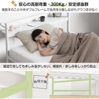 高い安定性と耐久性のため、こちらのベッドフレームは12本のパイプワイヤー (中骨)を設けたうえ、最も負荷にかかる中央連結部分にも太めのダブルパイプと中央脚のデザイン、6本脚でベッドフレームの全体の安定性がアップ。ベッド総体耐荷重は余裕の300Kgになります。頑丈で長く使えるベッドフレームです。宮棚までは約25.5cmなので、厚めのマットレスにも対応可能。