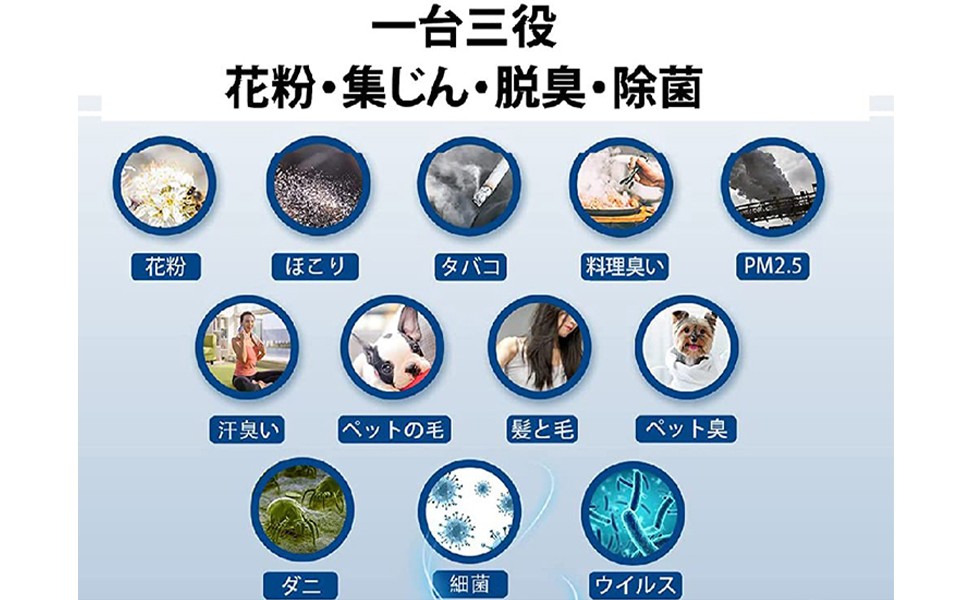 【特徴】喫煙者/受動喫煙者や飼い主やペットにとっても心地よい過ごす空間をサポートするため、特化した多重フィルター。花粉症・アレルギー症状・ウイルス対策に役立ちます!ペットの換毛期や花粉の飛散時期なども活躍します。