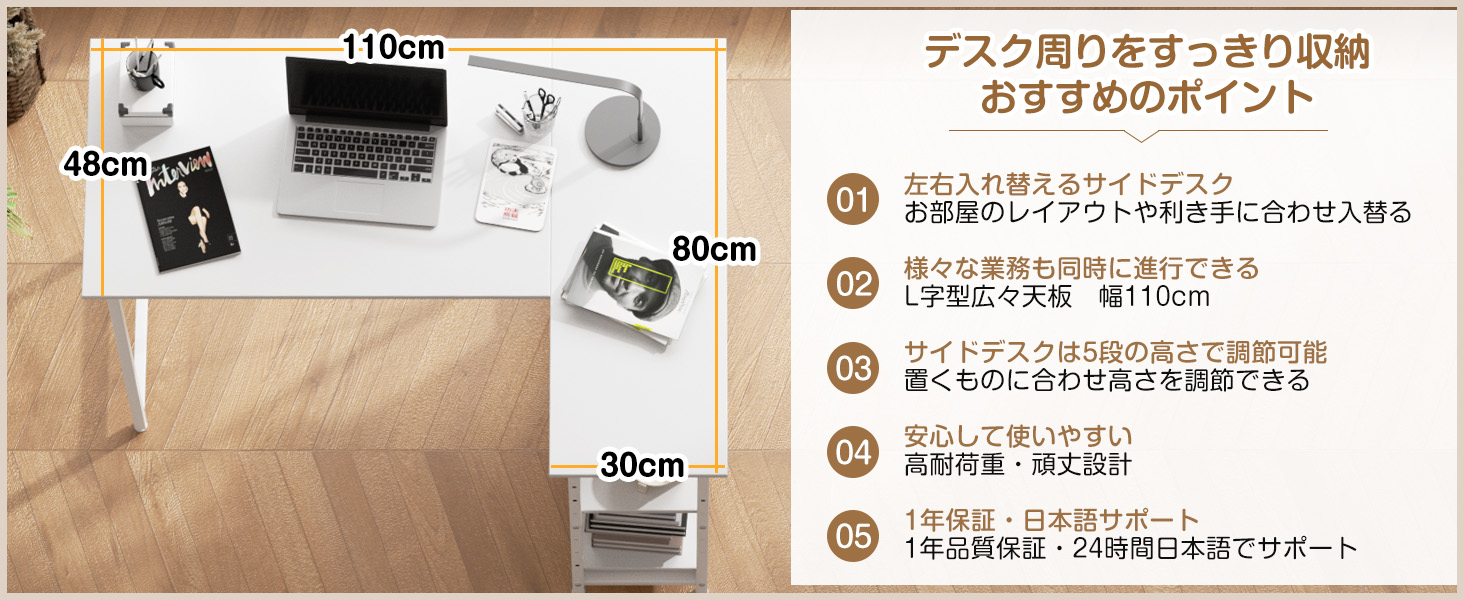 デスクの上はパソコンやプリンター、デスクライト、テレビ台、電話台などをはじめ、筆記用具、書類、電卓にスマホなど、デスク周りには置いておきたい必需品がたくさんありますので、このパソコンデスクがあれば、全部収納できます。サイドデスクの可動棚の高さを調節するとA4ファイルまたはPCケースなども置けます。