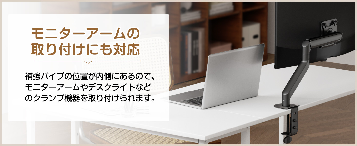 ホワイトとブラックの2カラー展開、マットな質感のスチールフレームが落ち着いた印象で、大人な雰囲気のお部屋にも馴染み、長持ちしやすいコーナーデスクです。背面は2本のクロスバーでしっかりデスクをサポートしながら横揺れも防げ、計6本のアジャスターが足には不快なガタつきを調整できます。