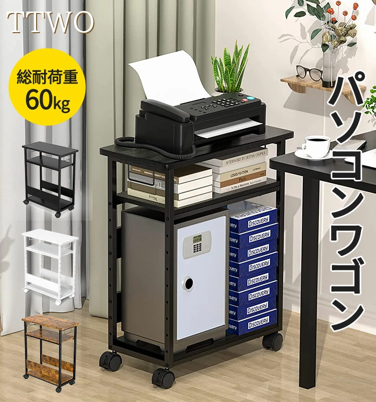 パソコンワゴン キャスター付き プリンター台 幅60×奥行30×高さ70cm 3段 パソコンラック pcラック 9段階調節 pcワゴン サイドデスク 木製 デスク オフィス収納