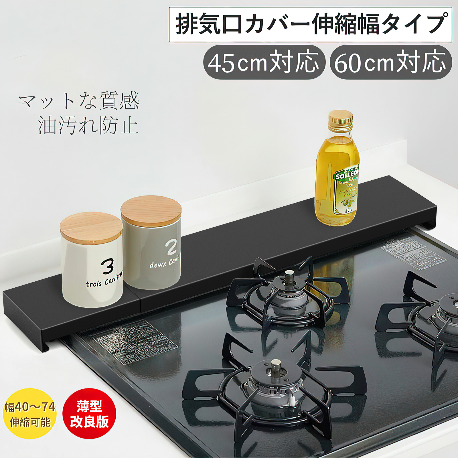 [薄型]排気口カバー 伸縮式 排気構カバー キッチン ガスコンロ カバー フラット 調味料置き可能 45cm/60cm対応 油汚れ防止 滑り止め 耐荷重5~10kg