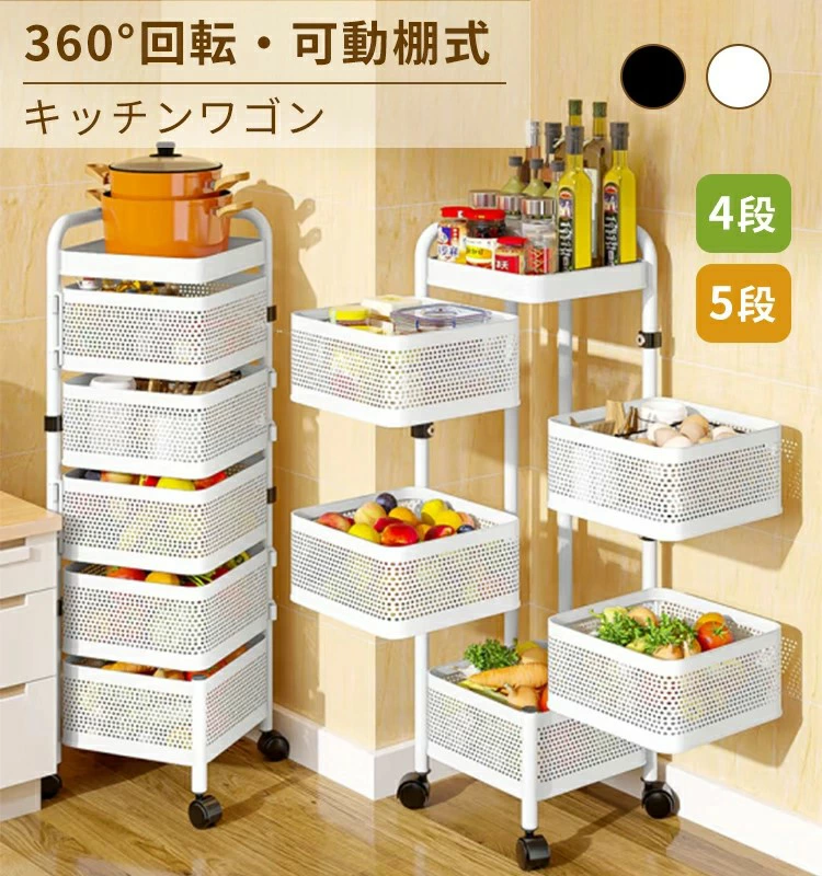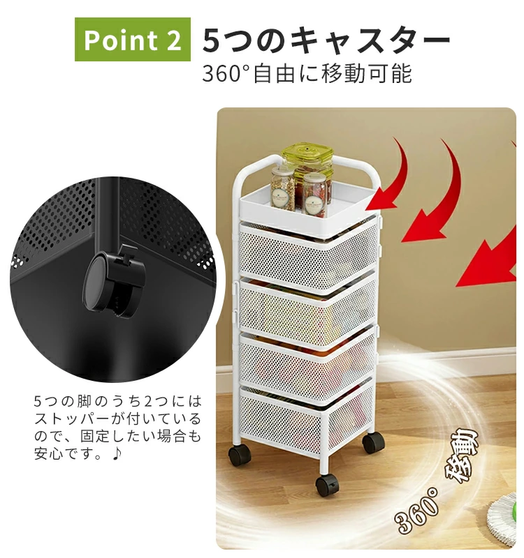 自由回転バスケットと360°自由回転ホイールデザインでスペースを取らなく、使用はとても便利です。バスケットは穴付き中空アウトデザインで通気性がよく、お掃除が簡単で、湿気が多い場所でも安心!