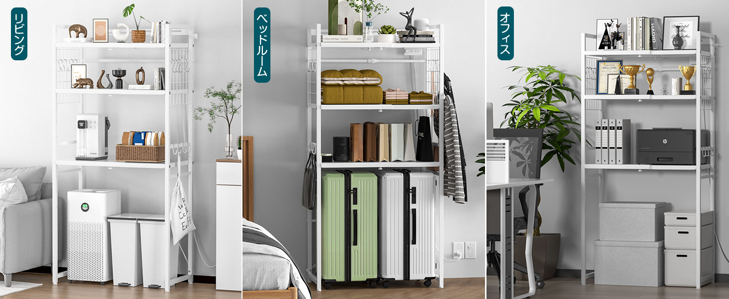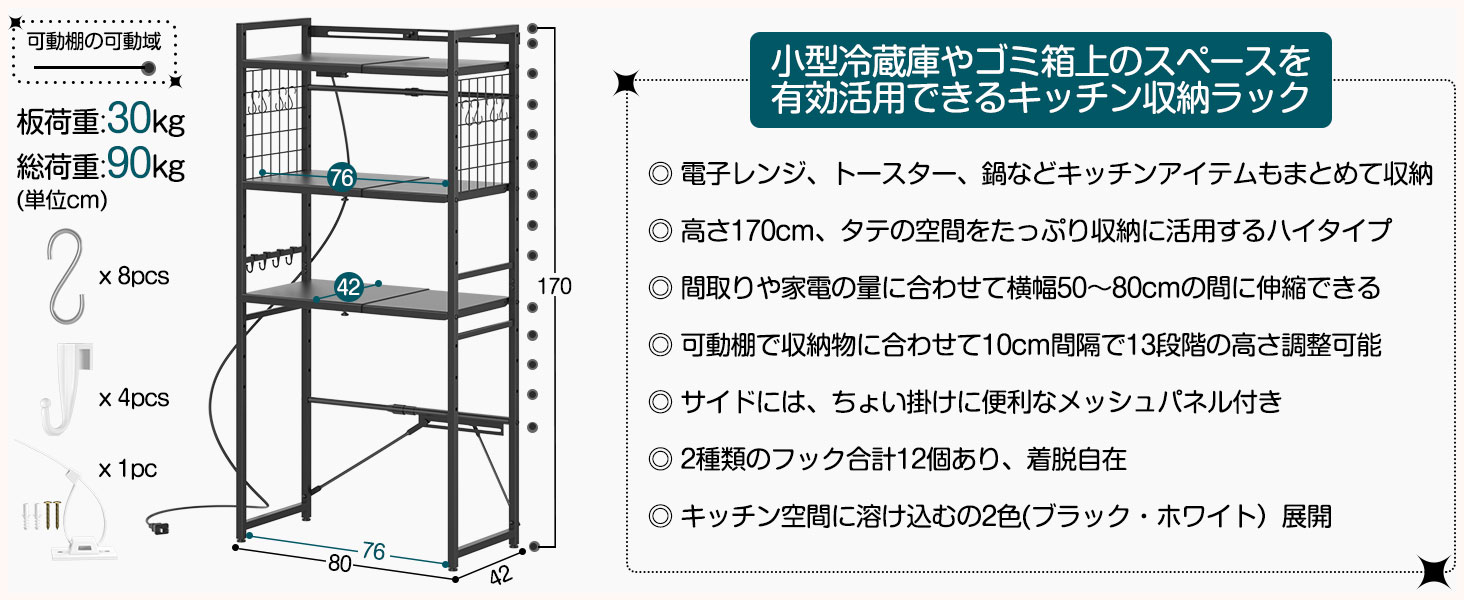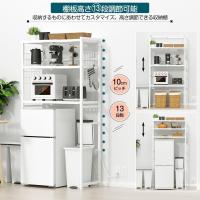 【大型レンジも置ける奥行き42cm】各棚番の奥行きが42cmがありますので、大型電子レンジ以外、トースター等の家電、フライパンや収納用バスケットなど大きな物も収納できます。1段あたり大小2枚の棚板で構成されており、取り外しも簡単♪デッドスペースになりがちなゴミ箱、小型冷蔵庫、乾燥機、洗濯機などの上収納をプラスします。背面に板がないため配線がしやすく、デザインはシンプルで、耐荷重も十分です。
