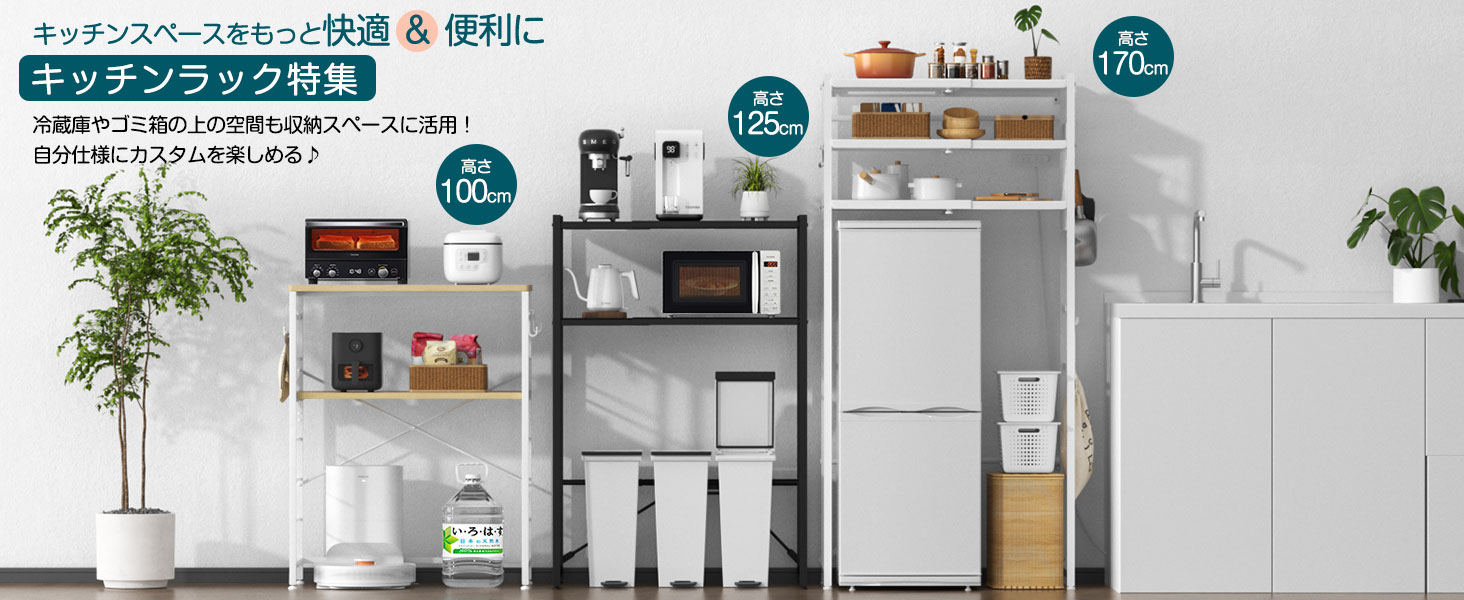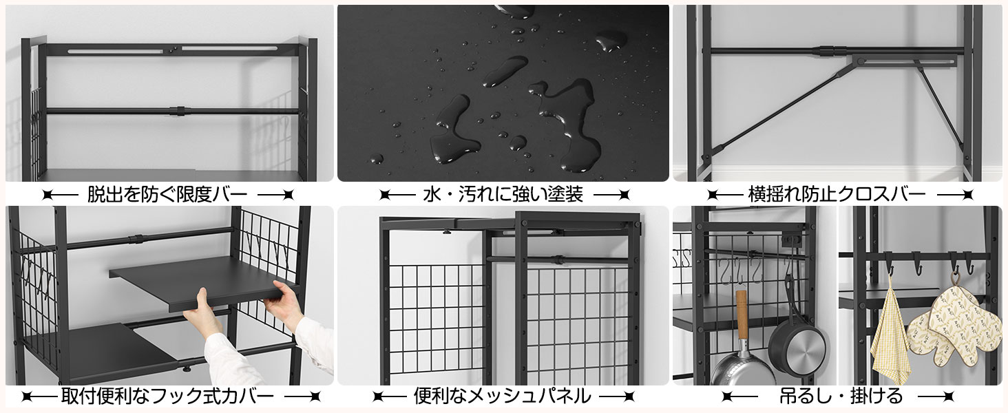 【総耐荷重90Kg・ぐらぐら揺れるを防止する頑丈設計】棚板1大+1小の耐荷重は30kgあり、3段式合わせて総耐荷重90kgとなります。ラック本体の高さは約170cmで、地震などの倒れやレンジの扉を開け閉めする揺れを軽減するため、背面および左右側面に筋交いのクロスバーを設けました。また、左右のサイドパネルも本体の負荷を分散しながら、骨組みも他社製品よりも0.5cmほど厚さを増やし、頼りになるレンジラックです。