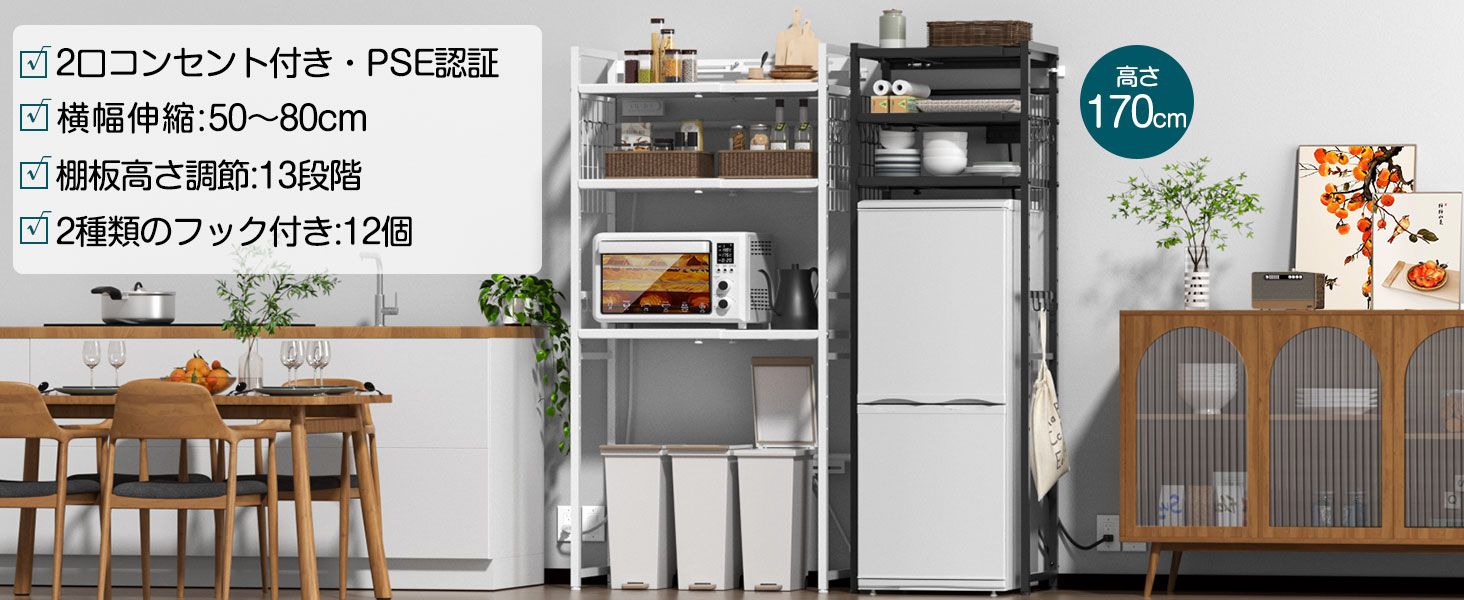 【左右に取りつける2口コンセント】ACアダプタ用さし込み口2個(1500W/2.1A)付き、ケーブル長さ約1.8mあり、キッチンラックに置いた電子レンジ、炊飯器、トースター、電気ケトルなどの調理家電の電源を確保できて、とても便利です。未使用時の差込口へのほこりの浸入を防止するシャッターを装備しています。トラッキング現象による火災やお子様のいたずらによる感電・火災の防止に役立ちます。2口コンセントの取り付け位置は家電の使用位置に合わせて左右、上下任意のパイプに取りつける可能です。