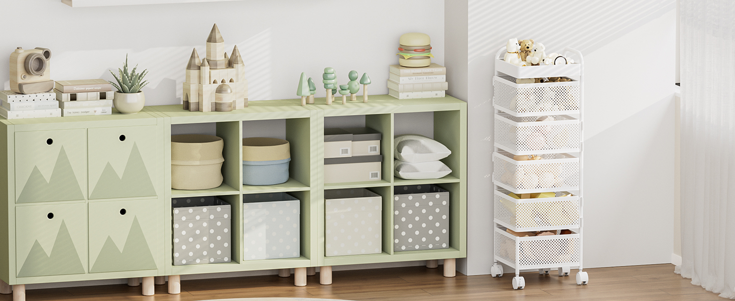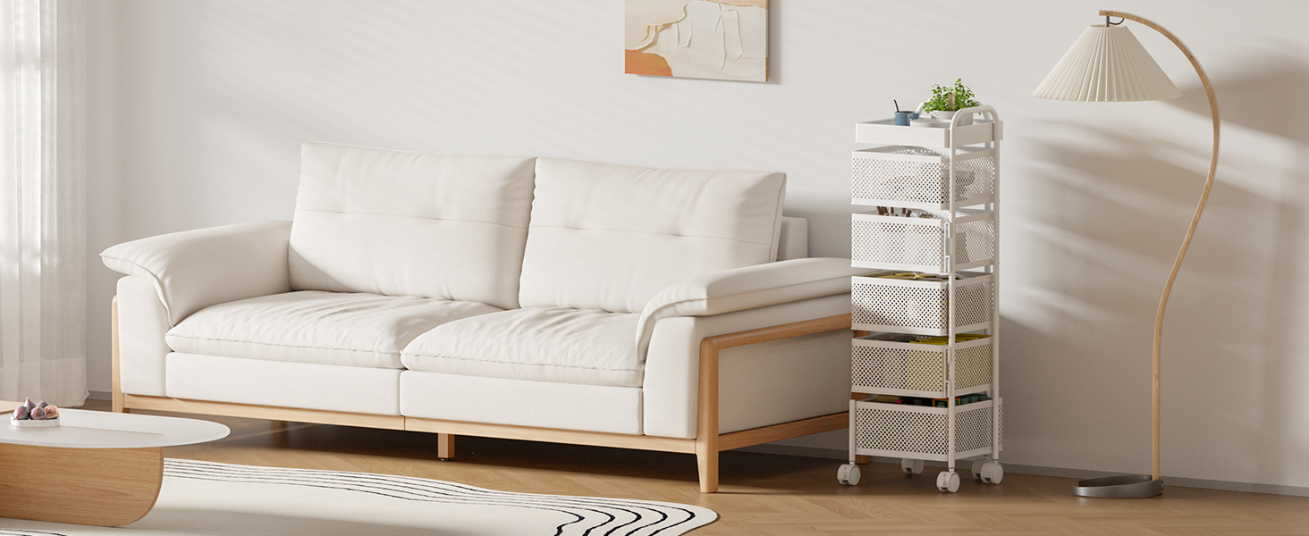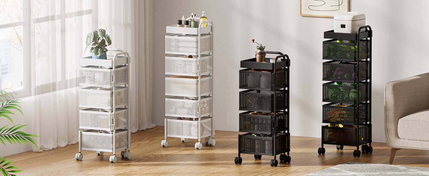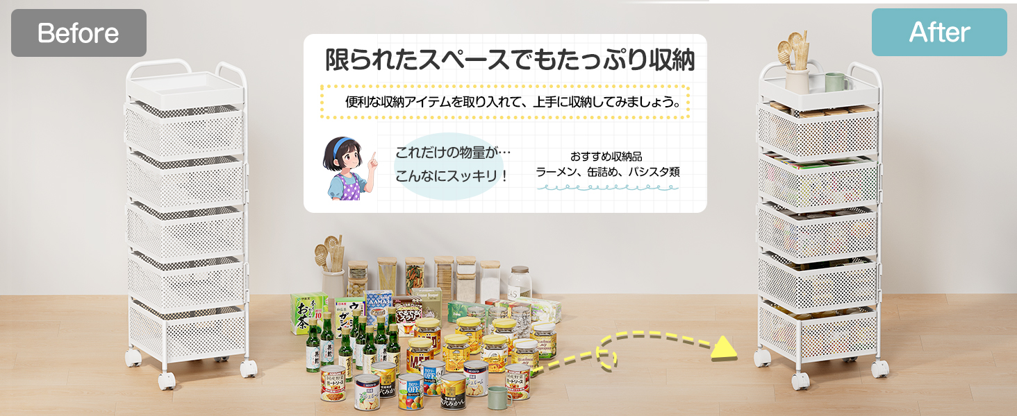 野菜、インスタント食品、お菓子、缶詰、果物、調味料、ペットボトル飲料などの食材を、キッチンのわずかな隙間に効率的にまとめ収納できます。キッチンはもちろん、トイレ、ベッドルーム、居間、子供部屋、書店、美容室など、多様なシーンでの整頓に活用できます。