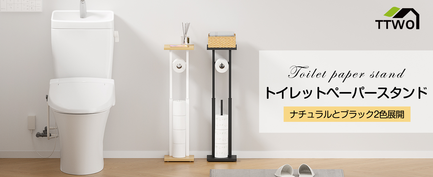 賃貸の狭いトイレでも使いやすいコンパクトさで、トイレットペーパーを交換するたびに収納棚から取り出すといった小さな悩みから解放されます。携帯などが置けるトレイが付いた、トイレットペーパースタンドです。