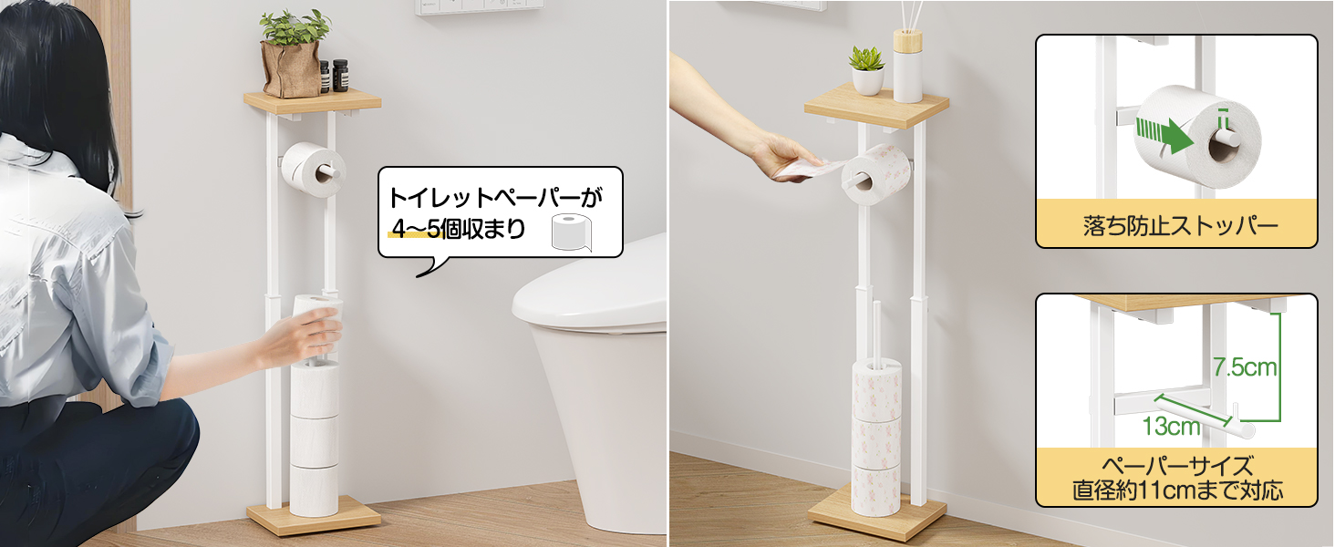 トイレットペーパーは5個収納できます。トイレの小物置き/トイレットペーパーホルダーとして使用可能です。