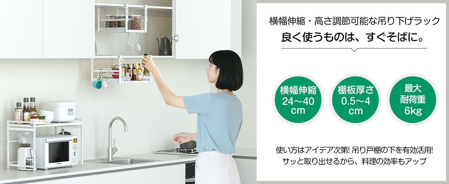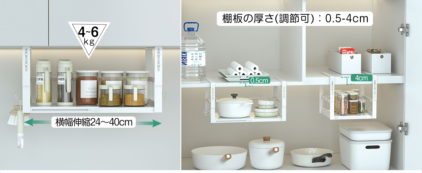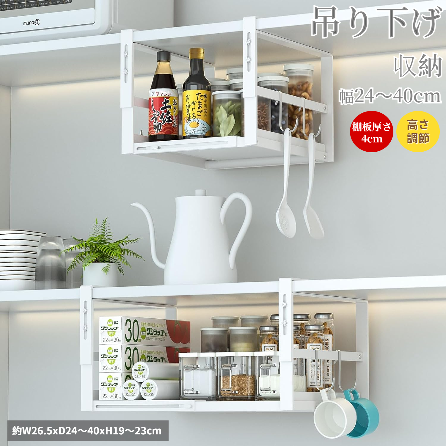 吊り下げ収納 キッチン 【棚板厚・横幅調節可】 戸棚下吊り下げラック 横幅伸縮 W24〜40cm 棚板厚さ4cmまで対応 差し込み つり戸棚ストッカー 吊り下げ式収納