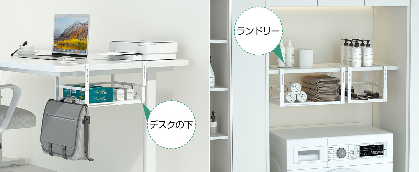 収納物に応じて横幅を24〜40cmの間で自由に調整可能な吊り下げラック。