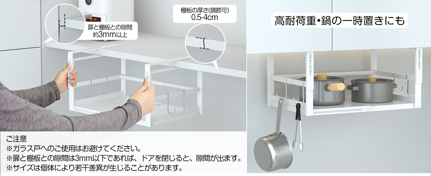 0.5〜4cmの棚板厚みに対応しており、高さも19〜23cmの範囲内で調整可能です。少し高さのある塩・胡椒などのスパイスも安心して置けます。キッチンの戸棚はもちろん、台所の棚下やシンク下、ランドリーなど、家中さまざまな場所でご使用いただけます。