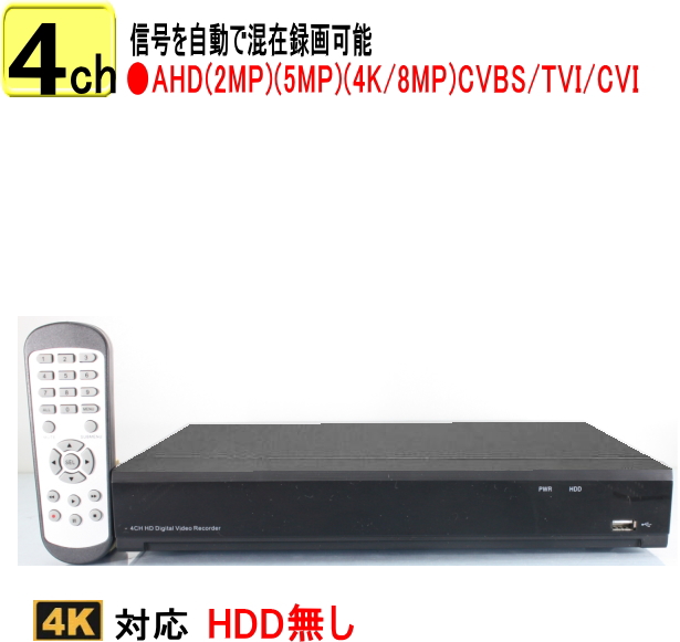 防犯カメラ監視カメラDVR 録画機4ch(HDD無しタイプ)AHD&TVI(4K.5M.4M.1080p.720p)CVI映像とアナログ(CVBS)を録画再生可能 PC,Android,iPhoneからの遠隔監視対応