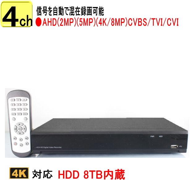 防犯カメラ監視カメラDVR 録画機4ch(HDD8TB内蔵)AHD&TVI(4K.5M.4M.1080p.720p)CVI映像とアナログ(CVBS)を録画再生可能 PC,Android,iPhoneからの遠隔監視対応