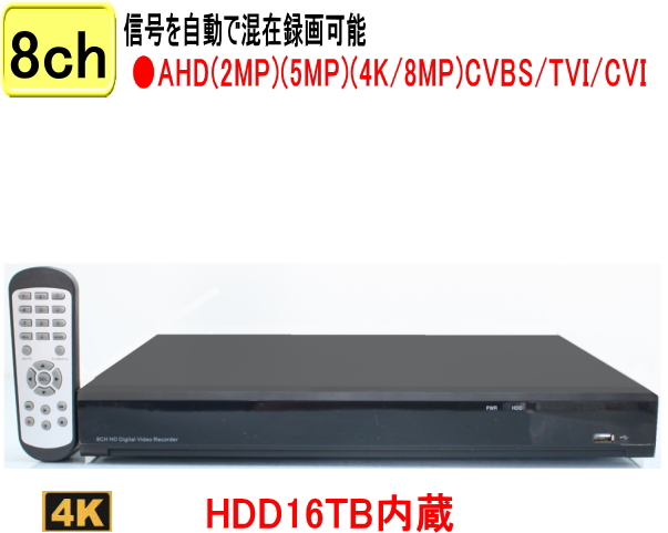 防犯カメラ監視カメラDVR 録画機8ch(HDD16TB内蔵)AHD&TVI(4K.5M.4M.1080p.720p)CVI映像とアナログ(CVBS)を録画再生可能 PC,Android,iPhoneからの遠隔監視対応