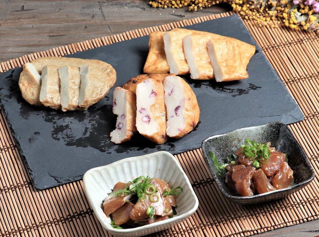 セット内容;真鯛りゅうきゅう漬け80g×2、ぶりりゅうきゅう漬け80g×2、はも天ぷら2枚、姫だこ天ぷら2枚、じゃこ天ぷら2枚、練わさび2.5g×6