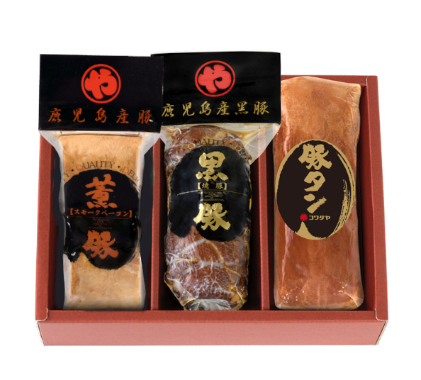 自社農場及び契約農場の鹿児島産豚・黒豚を使用。【焼豚】黒豚のさくら色の美しいお肉は、適度にはりがあり歯切れが良くほのかな甘みがあります。鹿児島産黒豚モモ肉の特徴を十分に生かし、炭火でじっくり時間をかけて焼き上げた焼豚です。【スモークタン】豚舌をスモークした一品です。豚舌とは思えぬやわらかさと味わいをお楽しみください。【ベーコン】鹿児島産黒豚のバラ肉のみを使用し、一本一本をサクラのスモークチップと炭火でじっくり時間をかけて、風味豊かに造り上げた一品です。バラ肉の赤身と脂身のかもしだすまろやかな味わいのバランスと炭火のハーモニーをお楽しみください。