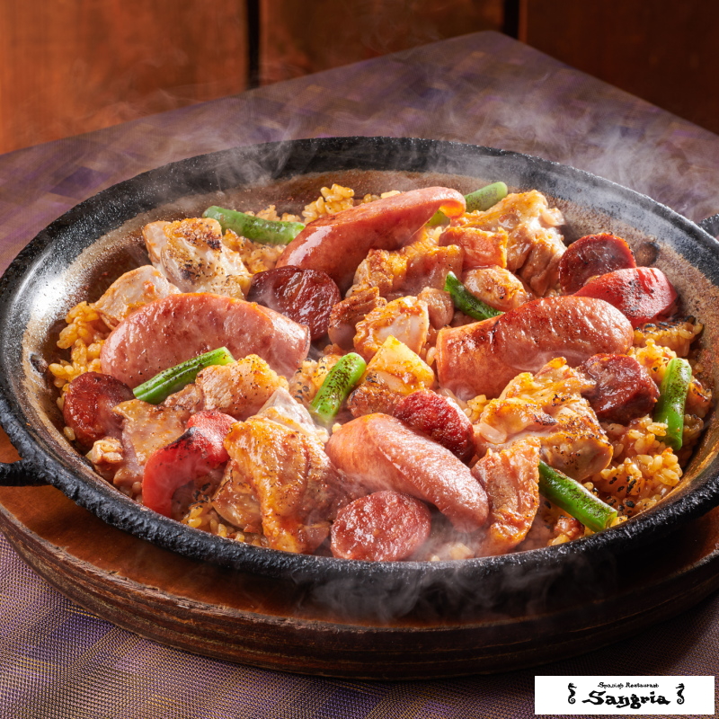 1975年、静岡の海沿いの高台にオープンした、地中海リゾートを思わせる駿河湾を臨む絶景のスパニッシュレストラン「サングリア」は、伝統的なスペイン料理や四季の素材を使用した創作料理に定評があります。チョリソー、那須高原豚、鶏肉をオリーブオイルでニンニク、玉ねぎとしっかり炒め素材の旨みを出し、国産米にお肉の旨みを染み込ませました。大ぶりのチョリソーを贅沢に1本使用したお肉のパエリアです。ピリ辛が病みつきになり、ビールとの相性も抜群です。