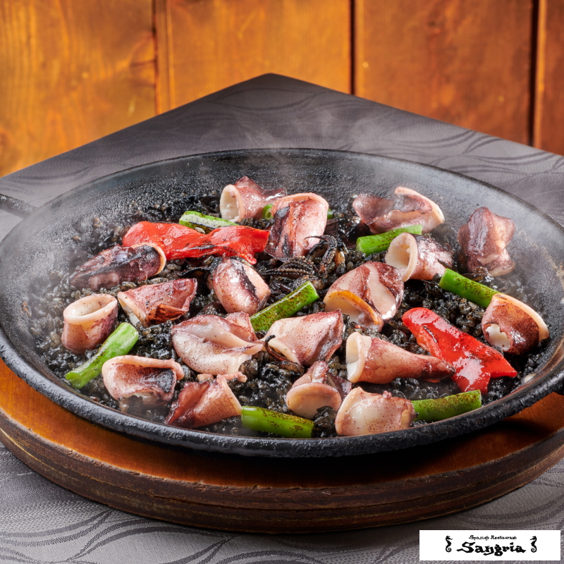 1975年、静岡の海沿いの高台にオープンした、地中海リゾートを思わせる駿河湾を臨む絶景のスパニッシュレストラン「サングリア」は、伝統的なスペイン料理や四季の素材を使用した創作料理に定評があります。ヤリイカをオリーブオイル、ニンニク、玉ねぎとしっかり炒め旨みを充分に引き出し、特製スープとイカ墨のコクが楽しめるイカ墨のパエリア。旨みが染み込んだお米と、たっぷり乗せたやわらかいヤリイカ。「サングリア」でしか堪能できない「イカ墨パエリア」です。