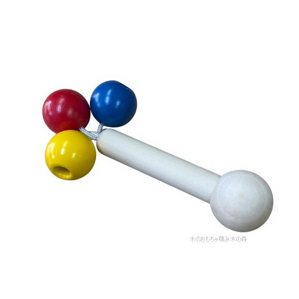 白木の軸の先端にカラフルな木の球がついています。どの方向に振ってもやさしい木の振れあう音がします。