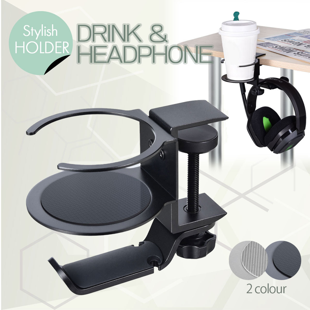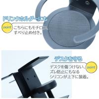 ドリンクホルダー デスク ヘッドホンスタンド ヘッドホンハンガー ヘッドホン収納 リモートワーク バッグハンガー 机 ケーブル クランプ式 ブラック シルバー