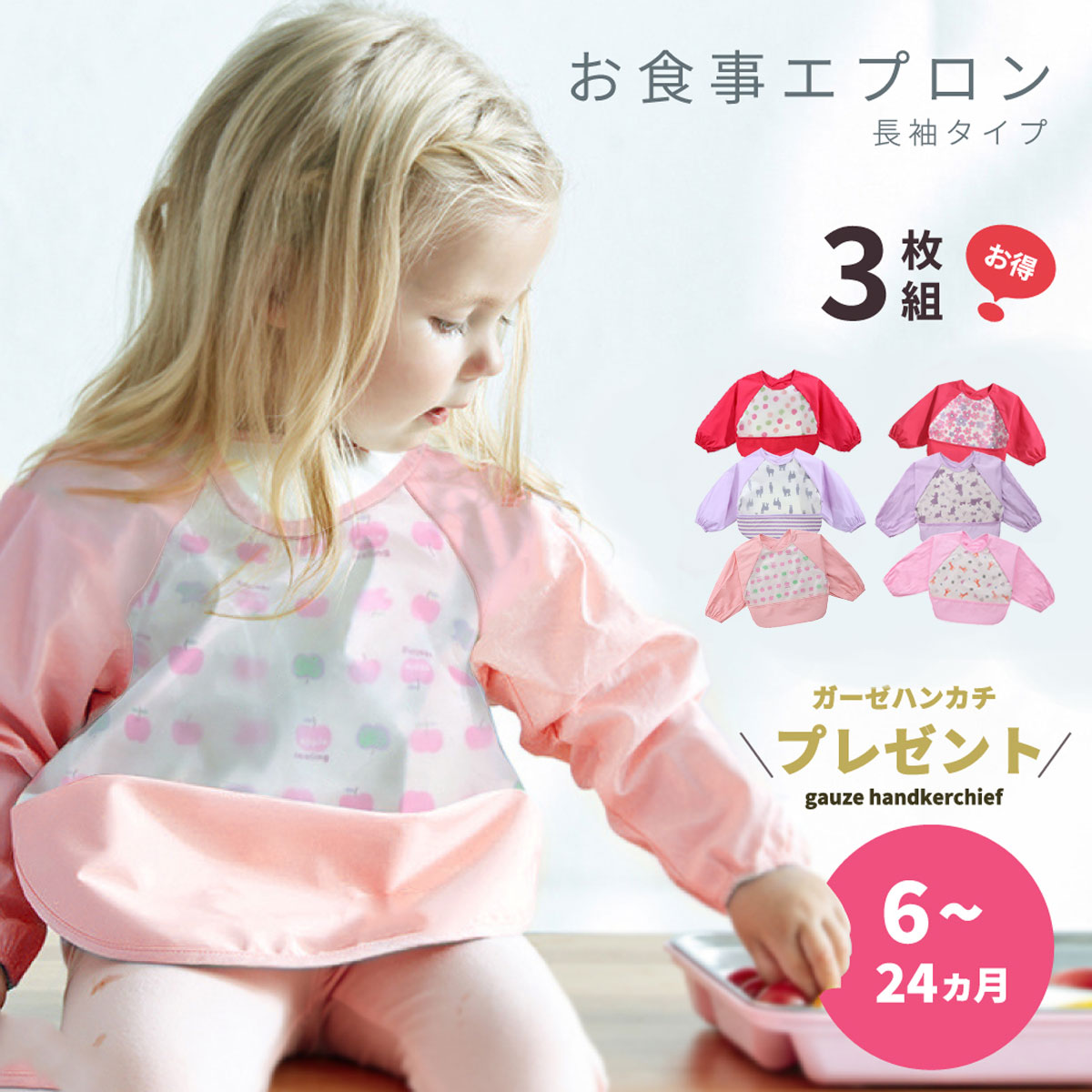 お食事エプロン 長袖 食べこぼしガード 長袖タイプ スモック 食事用 お絵かき用 泥遊び用 キャッチポケット付き ベビー 長袖防水エプロン 3枚組 (女の子用)
