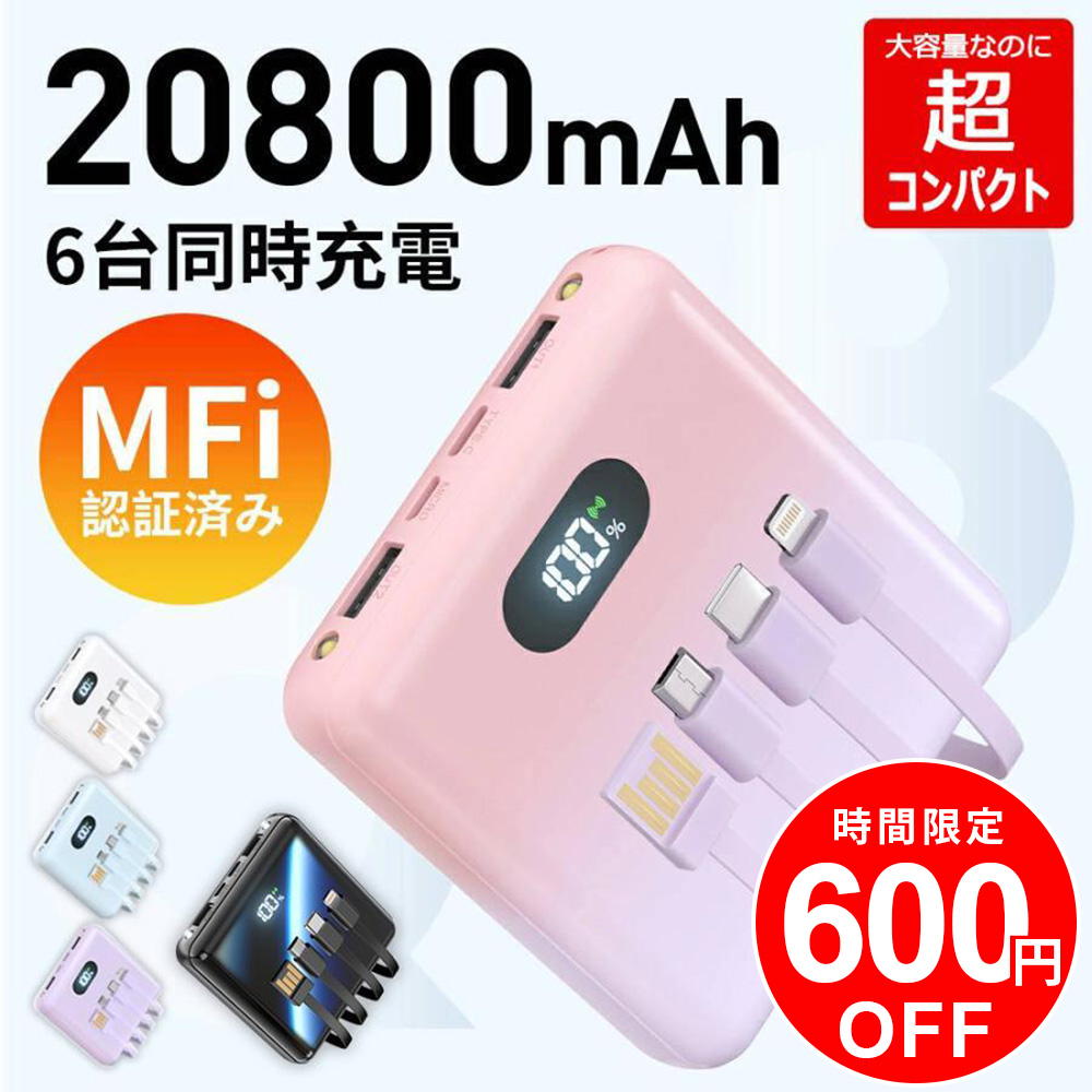 【クーポンで1980円・期間限定!】モバイルバッテリー ワイヤレス充電 4本ケーブル内蔵 MFi認証 充電器 20800mAh 軽量 6台同時充電 3way蓄電 LEDライト 残量表示