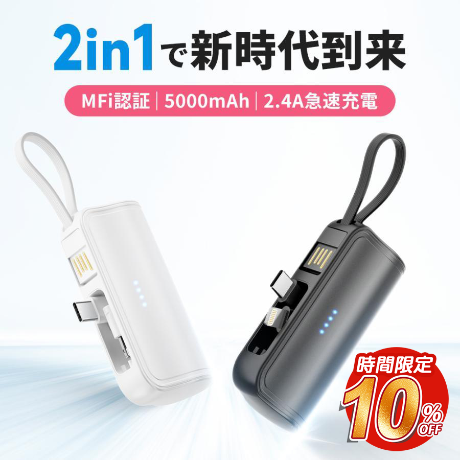モバイルバッテリー Q20 5000mAh 2in1 iPhone Lightning type-c 一体型 収納式コネクタ 2.4A急速充電 小型 軽量 MFI認証 2WAY蓄電 残量表示 PSE認証済