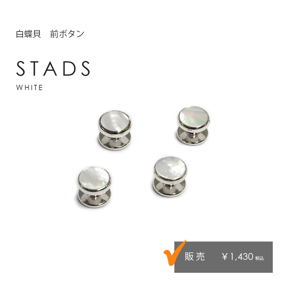天然の白蝶貝を使用した前ボタン(スタッズ)の単品販売、高級感あるカットで綺麗なツヤがあるタキシードステーションオリジナルの定番アイテムです。父親定番のモーニングから、少しフォーマル感をプラスしたい時などオールマイティにコーディネート出来るアイテムです。