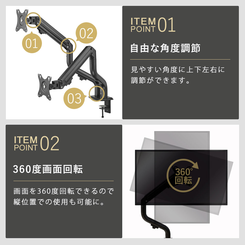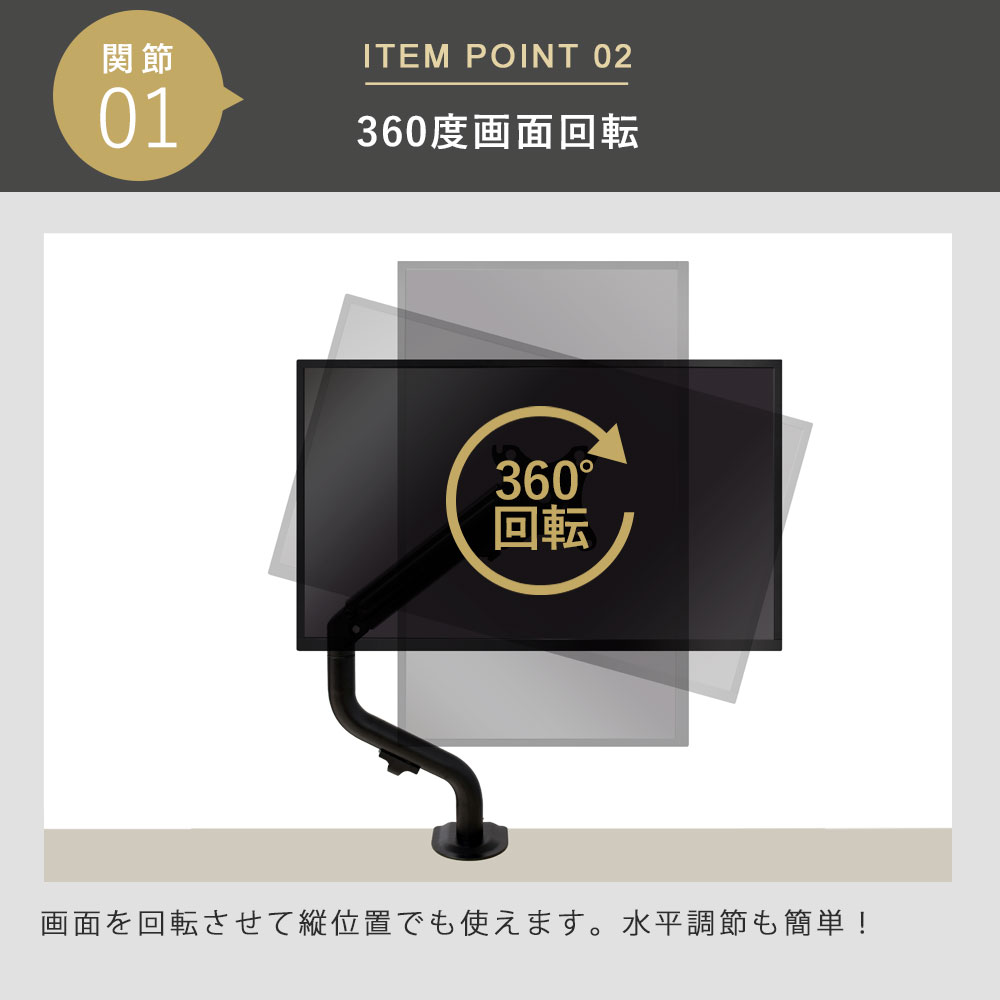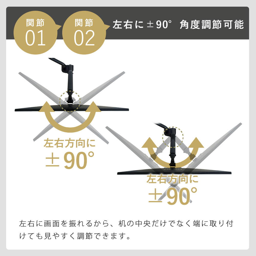 | 上+90度、下−45度、左右±90度、360度回転 |