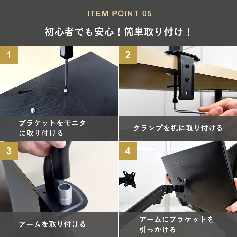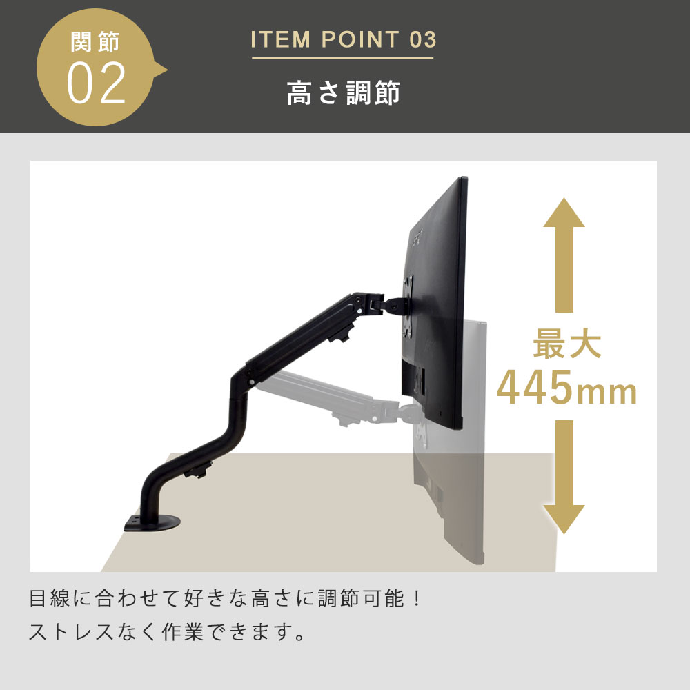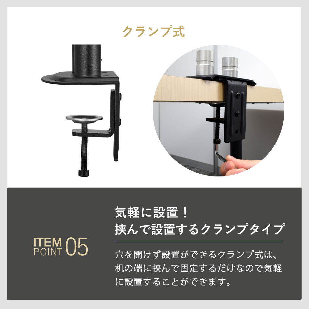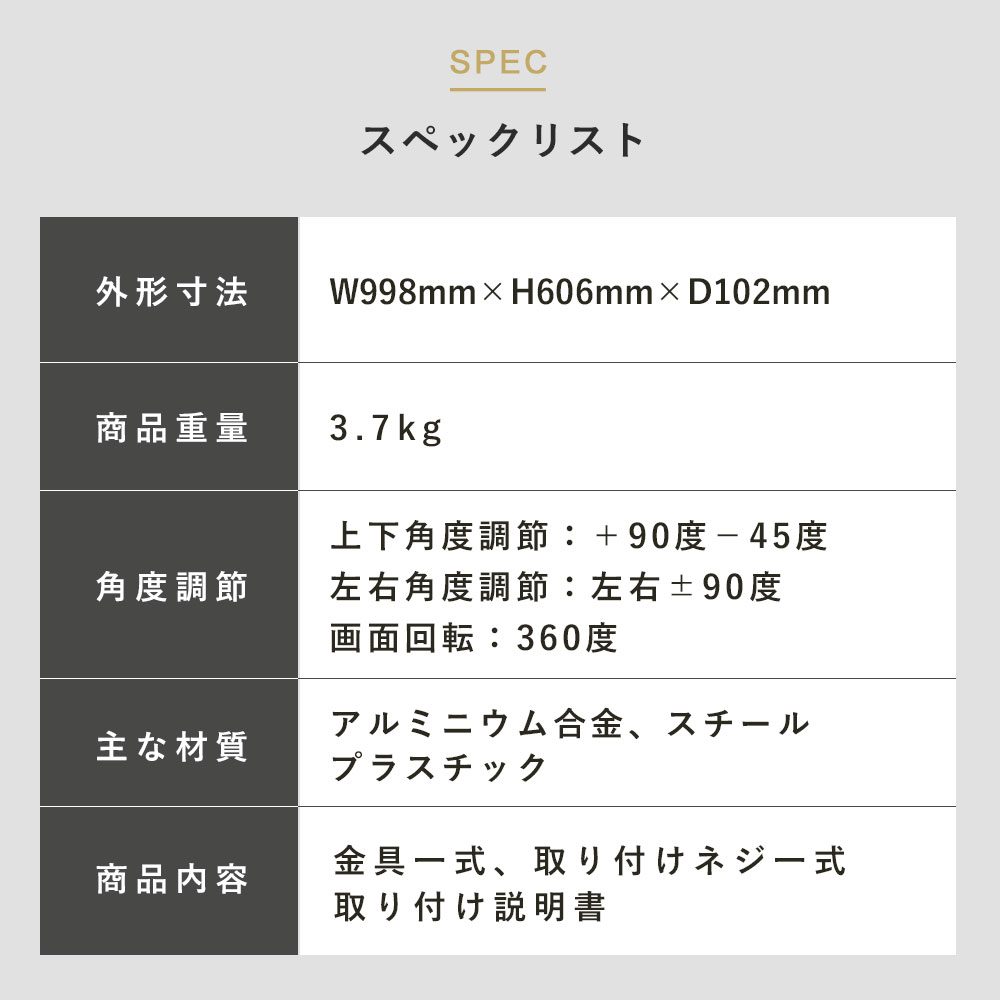 | ・モニター背面にネジ穴があいている事 ・モニター背面がフラットである事 ・モニターサイズが13〜32インチである事 ・モニター重量が2〜8kgである事 ・モニター背面のネジ穴の間隔が、「75×75、100×100(VESA規格)」である事 |