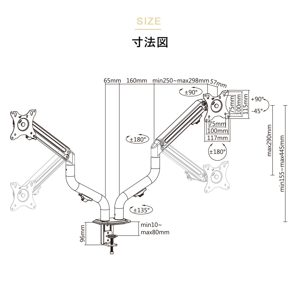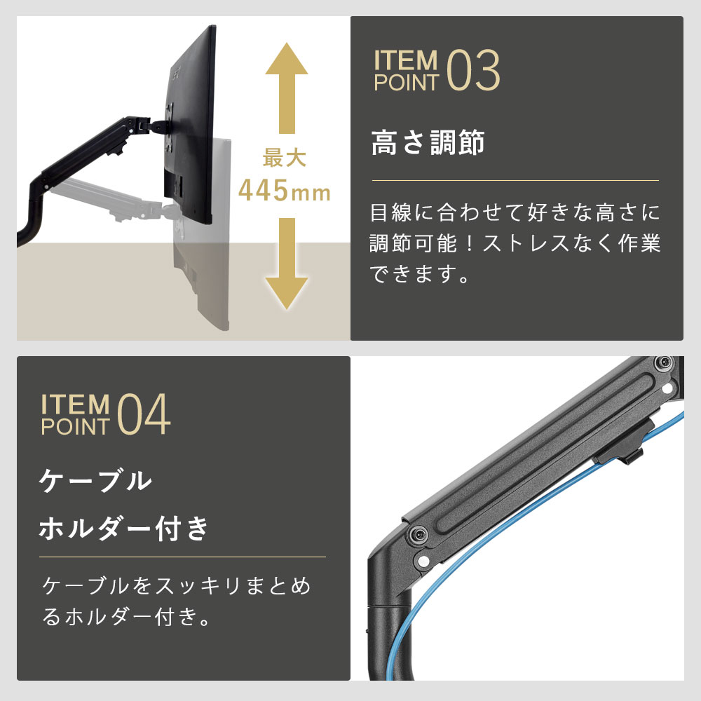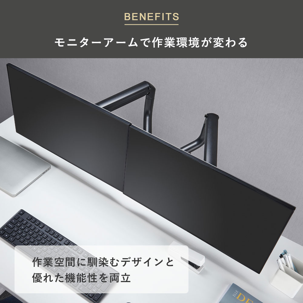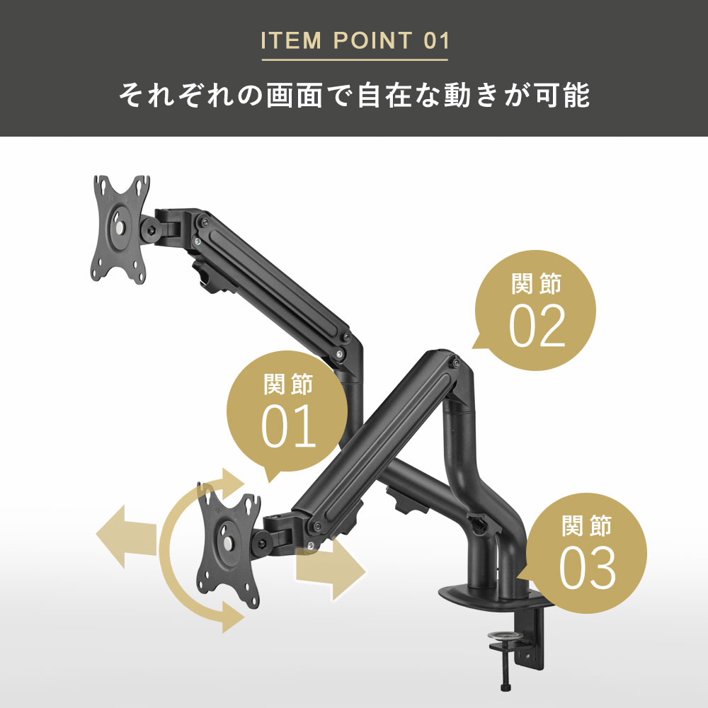 | ・モニター背面にネジ穴があいている事 ・モニター背面がフラットである事 ・モニターサイズが13〜32インチである事 ・モニター重量が2〜8kgである事 ・モニター背面のネジ穴の間隔が、「75×75、100×100(VESA規格)」である事 |
