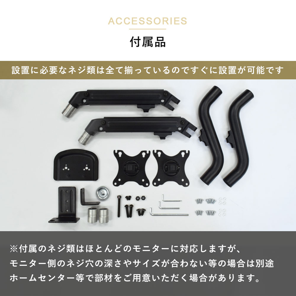 | 商品には様々な種類のネジ・ビス類が付属しておりますが、 ・モニター側のネジ穴深さと付属するネジの長さが合わない 等の理由により、別途ホームセンター等で部材をご用意いただく場合があります。 |