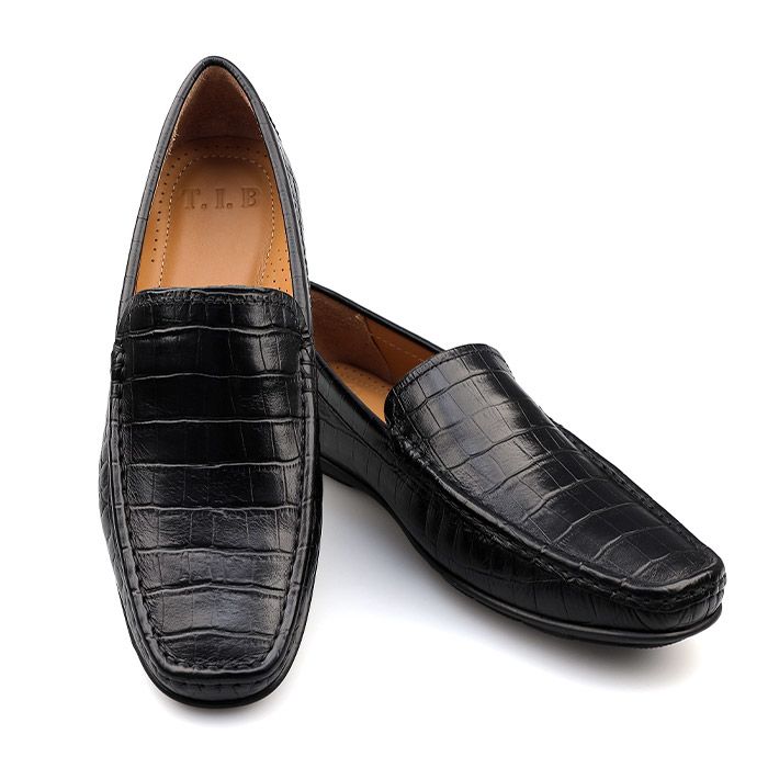 即日発送可 TIB ティーアイビー 本革 ソフト牛革 スリッポン デッキシューズ ドライビングシューズ 型押し クロコ調 ビジネスシューズ メンズ 紳士靴 ブラック
