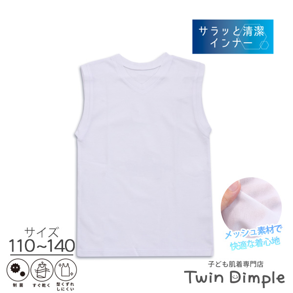 子供 肌着 男の子 ジュニア 無地 タンクトップ (制菌 サラッと清潔 インナー V首スリーブレス メッシュ 白 110~140 (1125)