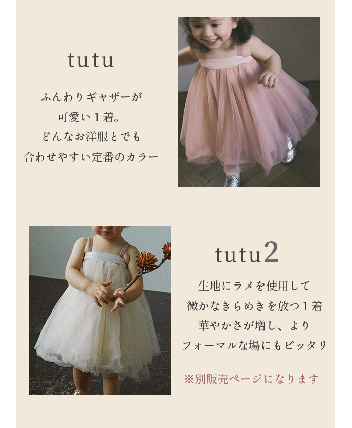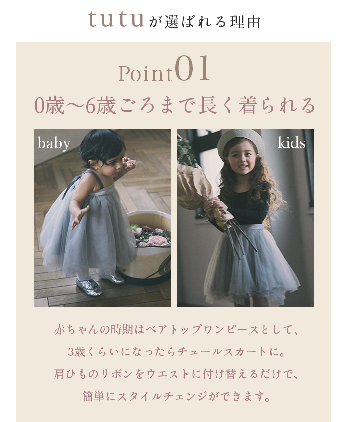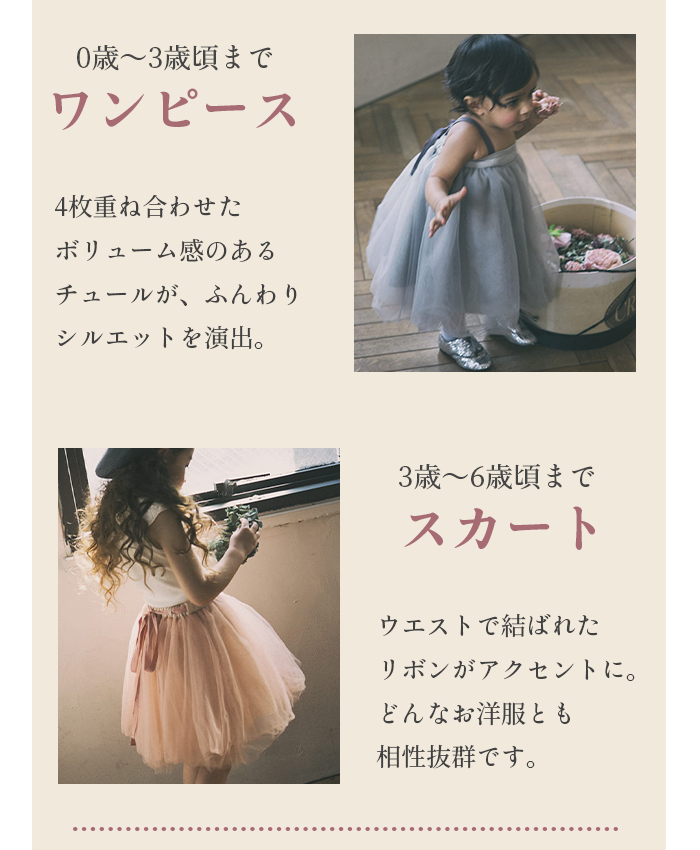 【特徴】成長にあわせて異なる着こなしが楽しめる、女の子の夢を詰め込んだチュチュスカート。ベビーの時期はベアトップのワンピースとして着用いただけます。幾重にも重なるピンクのチュールが華やかで、パーティーシーンにもぴったり。3歳前後になったら、取り外しできる肩ひものリボンをウエストに付け替え、ふんわりキュートなチュールスカートに大変身。ガーリースタイルにはもちろん、カジュアルなコーディネートのアクセントとしても使える万能アイテムです。姉妹で共有することもできる、人気の1サイズ2WAY仕様。マールマールのオリジナルパッケージ入りで、プレゼントにもおすすめです。