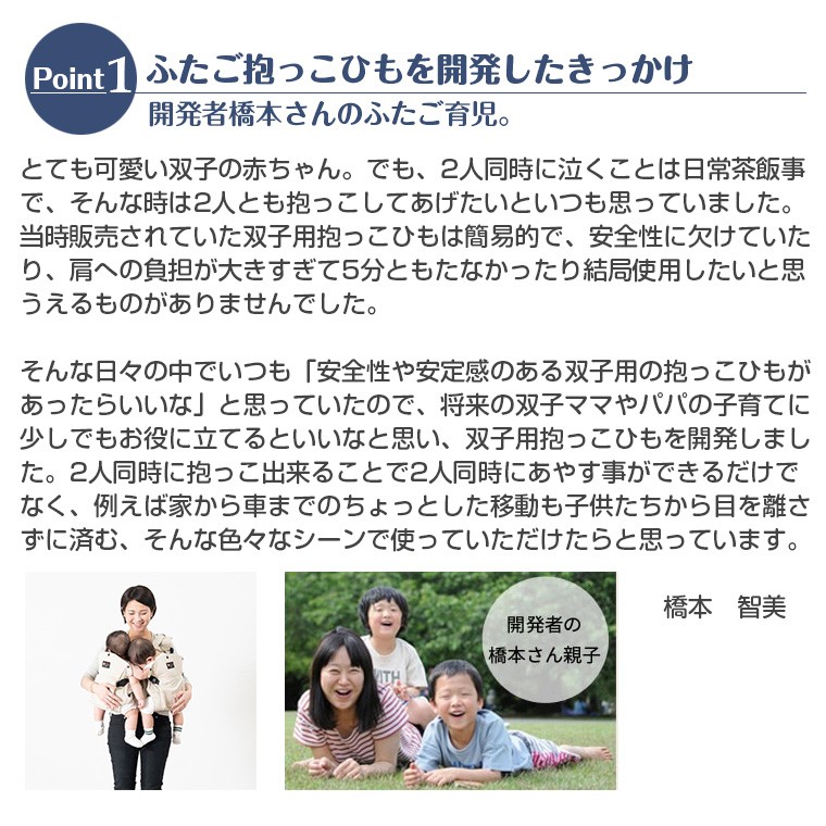 【特徴】napnapふたご抱っこひもは、実際に双子の子育てを経験されたママから持ち込まれた企画で、双子育児の大変さ・不便さをご本人から伺いながら開発された抱っこひもです。