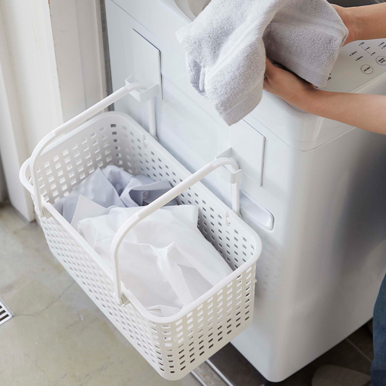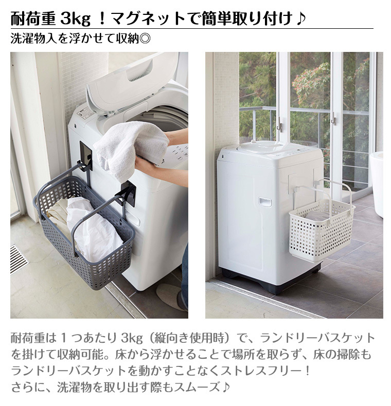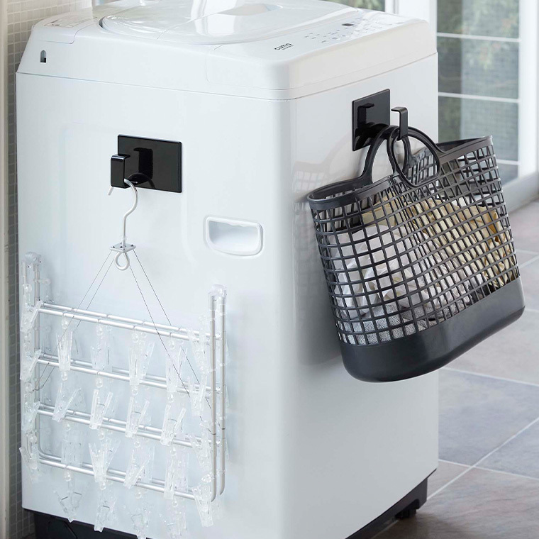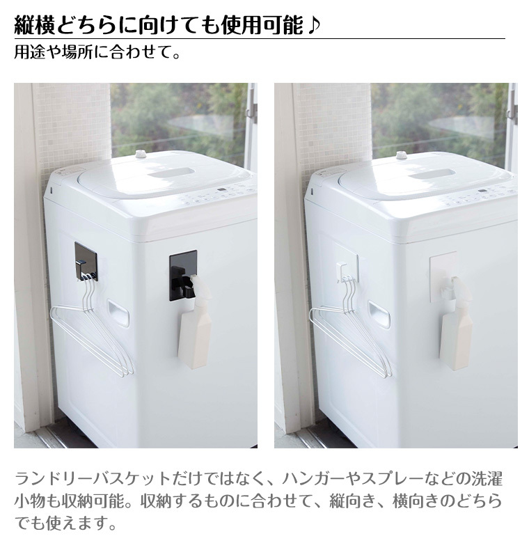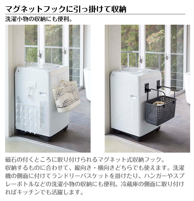 【特徴】磁石の付くところに取り付けられる2個セットのマグネット式収納フック。収納するものに合わせて、縦向き・横向きどちらでも使えます。洗濯機の側面に付けてランドリーバスケットを掛けたり、ハンガーやスプレーボトルなどの洗濯小物の収納にも便利。冷蔵庫の側面に取り付ければキッチンでも活躍します。