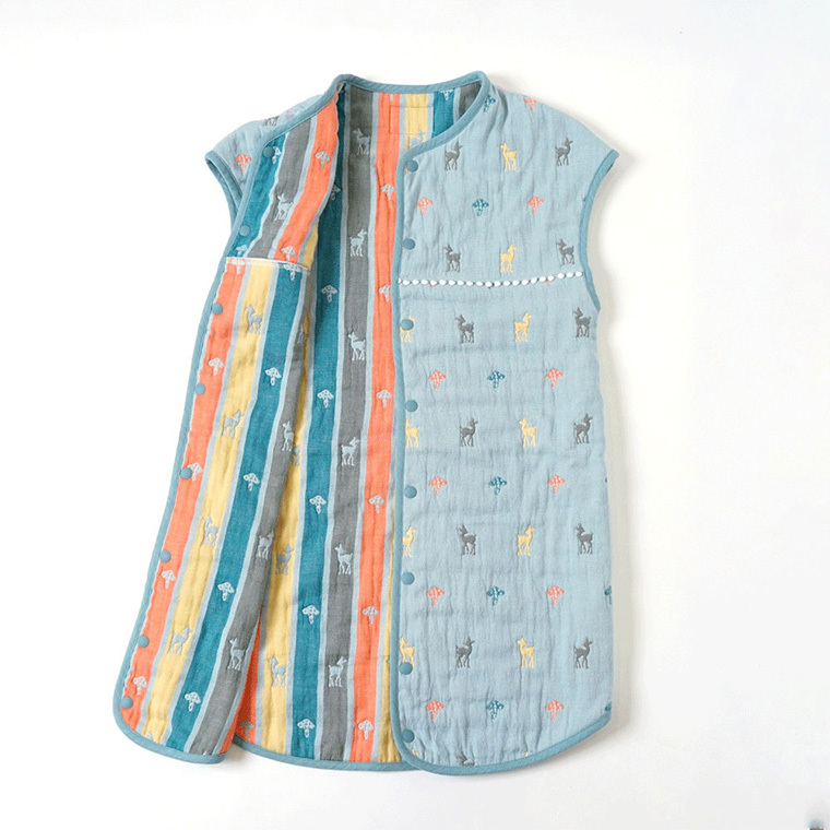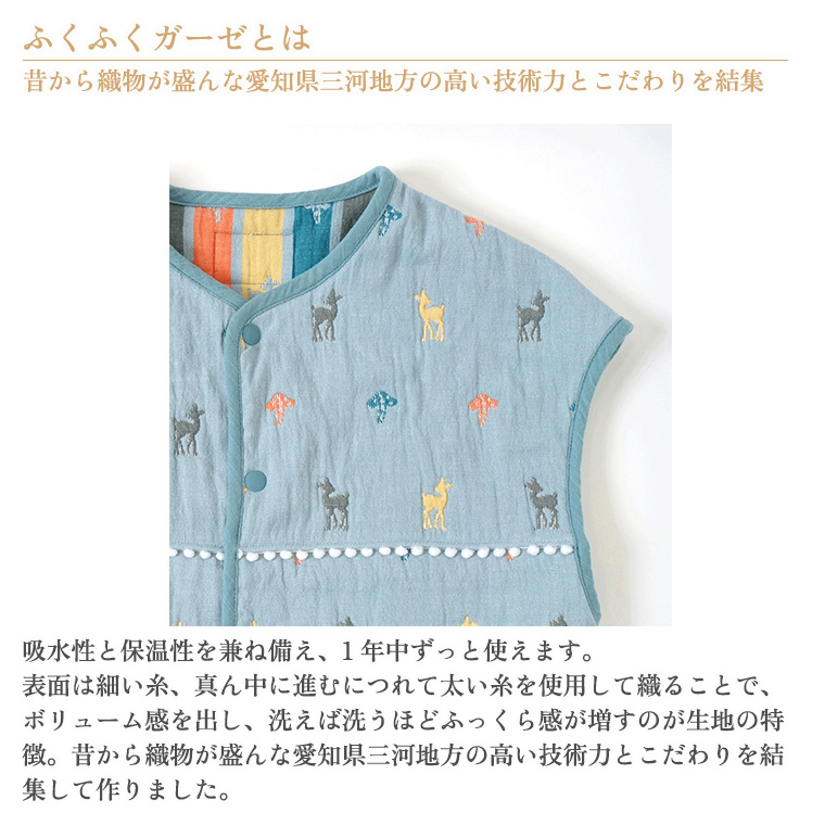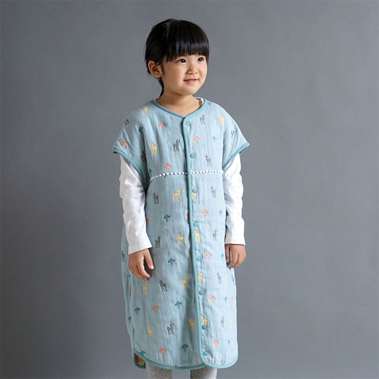 寝冷え防止に1年中活躍し、お布団からはみ出しても安心。 ボタンを止めて、簡単に着られるベスト型です。