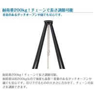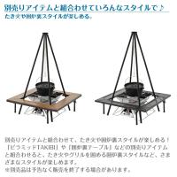 耐荷重約200kgを誇る頑丈な吊り鍋料理スタンドは安定感のある4本脚。マットブラックに塗装されたスチール製のフレームにより重厚感のある仕上がりに。別売りの囲炉裏テーブルやピラミッドTAKIBIと組み合わせて使えば楽しみ方がさらにひろがる。