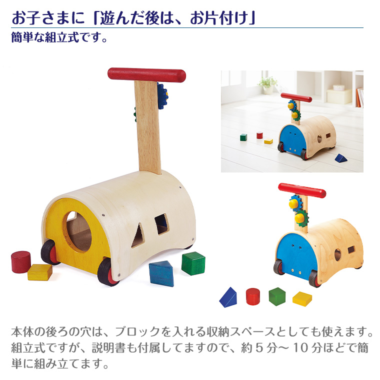 ハンドルの高さを2段階調節し、手押しとしても、乗用としても使える玩具です。本体には型はめブロックやギア・木ねじもついていて、いろんな遊びが楽しめます。