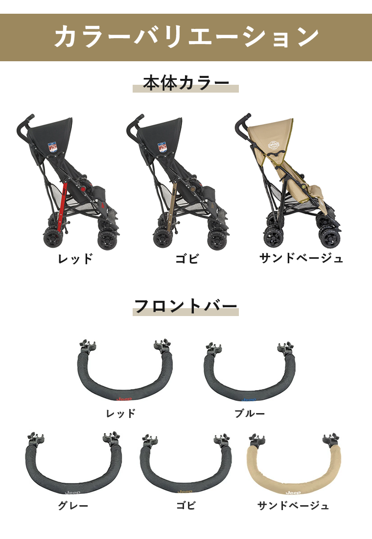 【特徴】一番小さなJEEPベビーカー!足回りがタフなJeep車のように、タフな走行を目指してクラス最大級のタイヤを装備。ゼンリンは上下左右に対応して路面をとらえる、3Dソフトサスペンション付き。路面の振動を吸収して、滑らかな走行を実現。ボディは指挟み防止機能付きの安心・安全設計。前輪キャスターは回転をロック出来る機能付き。悪路や踏切などでも、まっすぐに走行するので、ふらふらせず安心です。急な乗車に対処出来るように、前輪の真上に閉まった電車のドアが感知出来る太さのパーツがついています。折りたたんだ時、A4サイズのスペースに収まるコンパクトサイズ。しっかりした自立スタンドも付いて便利です。持ち運びに便利なショルダーストラップ付き。