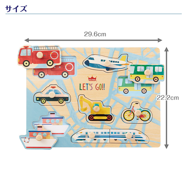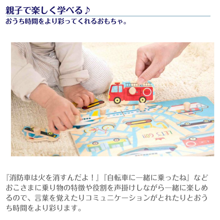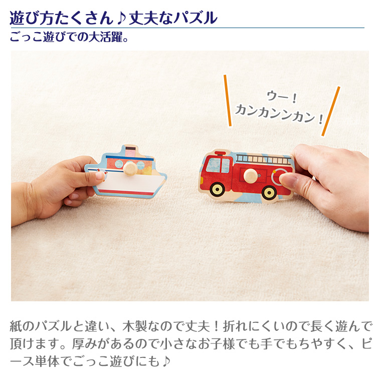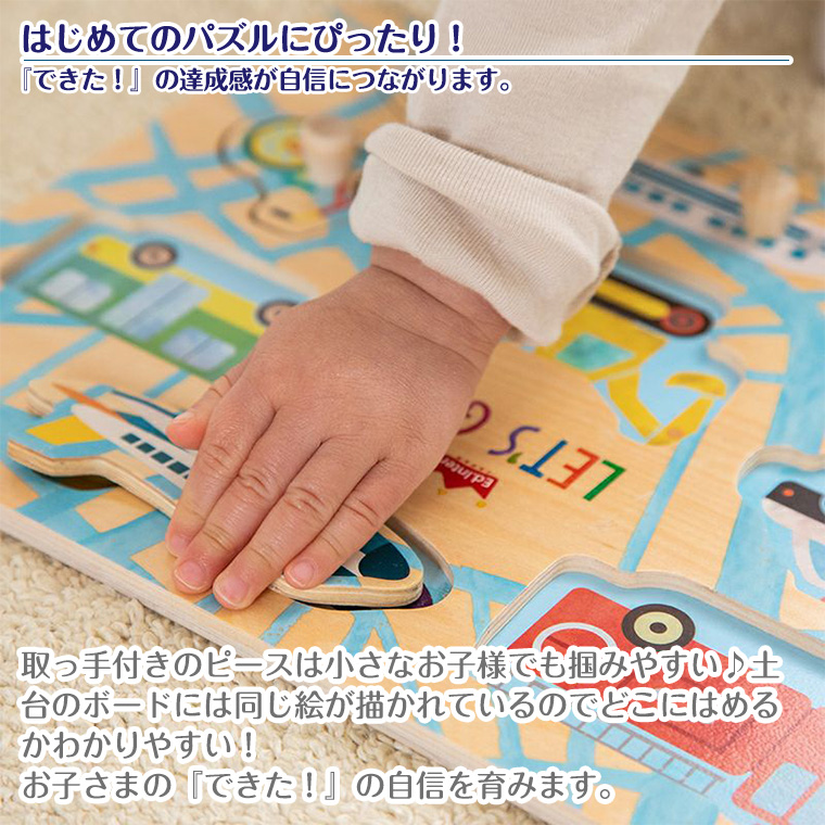 【特徴】人気の乗り物8種類を集めた木のパズル。大きいペグ(取っ手)付きなので、低年齢から楽しく遊べます。乗 り物のピースをめくると下に同じ絵が描かれているので、絵を合わてはめ込むパズルを楽しめます。頭や指 先を使う事で、子どもの考える力や創造力をぐんぐん伸ばします。
