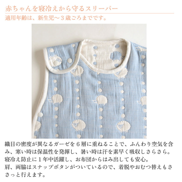 【特徴】織目の密度が異なるガーゼを6層に重ねることで、ふんわり空気を含み、寒い時は保温性を発揮し、暑い時は汗を素早く吸収しさらさら。寝冷え防止に1年中活躍し、お布団からはみ出しても安心。