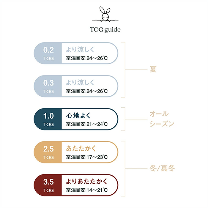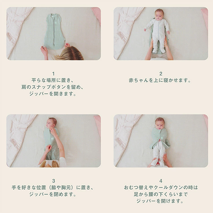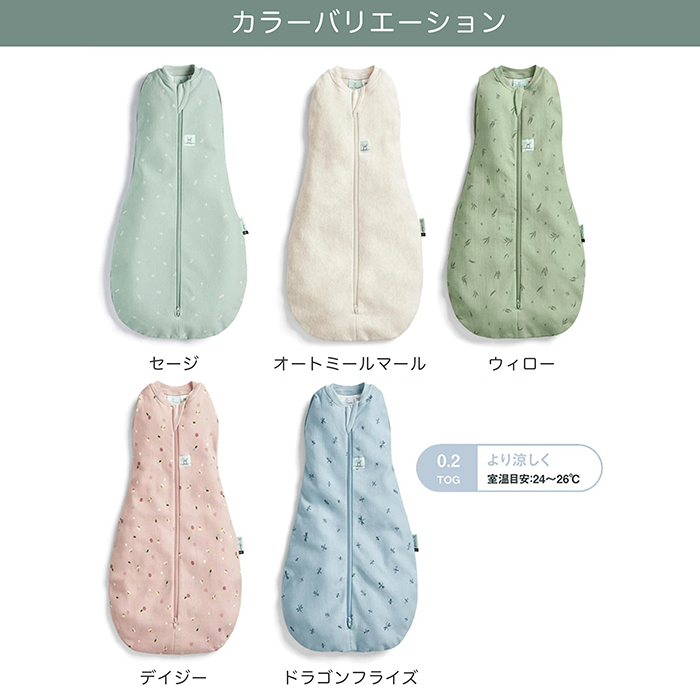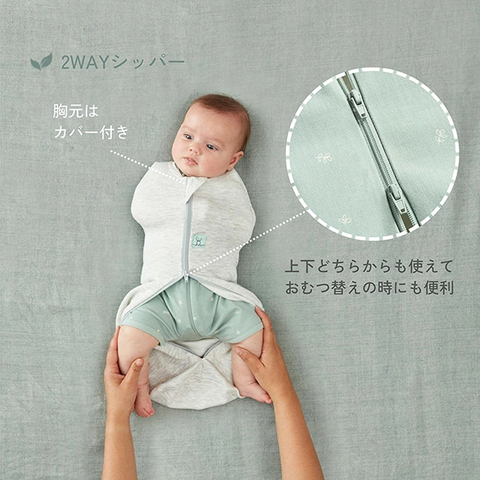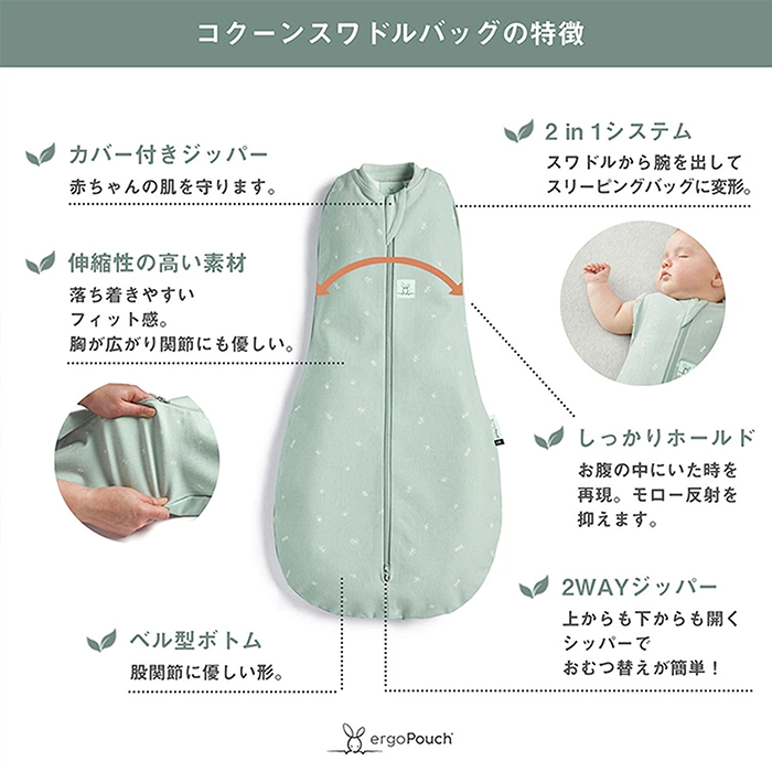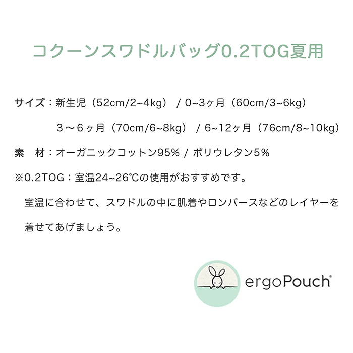【特徴】赤ちゃんの夜泣き対策に!モロー反射を防いで赤ちゃんもママもぐっすり睡眠!着るおくるみ。 サイズ:新生児(52cm/2-4kg)/0〜3ヶ月(60cm/3-6kg)/ 3〜6ヶ月(70cm/6-8kg)/6〜12ヶ月(76cm/8-10kg) 素 材:オーガニックコットン 95% / ポリウレタン 5% ※0.2TOG:室温24〜26℃の使用がおすすめです。 室温に合わせて、スワドルの中に肌着やロンパースなどのレイヤー を着せてあげましょう。