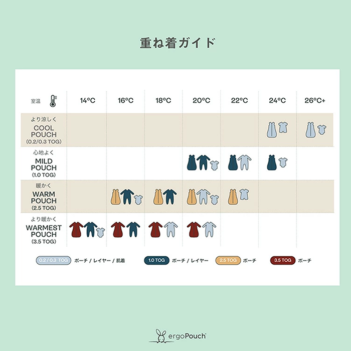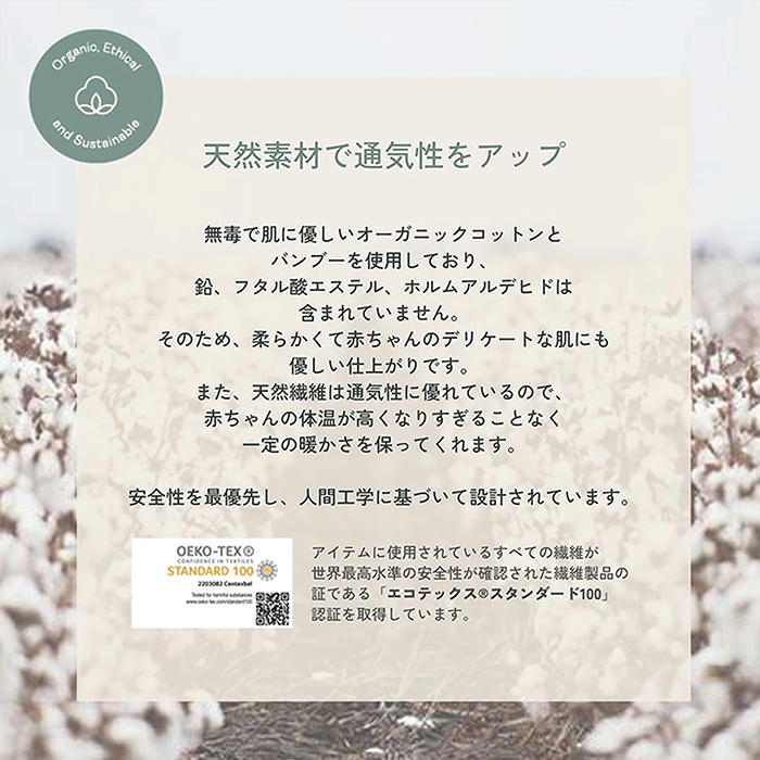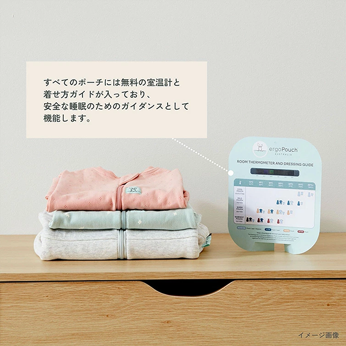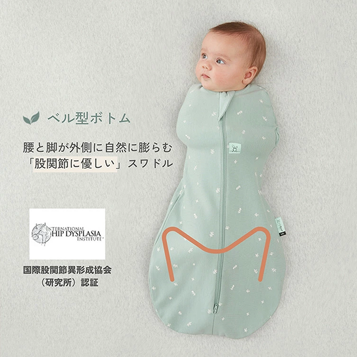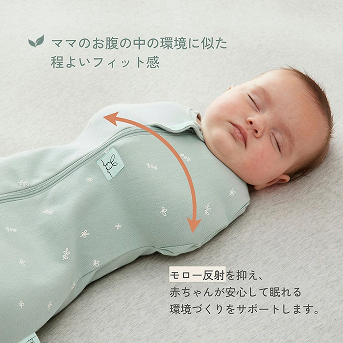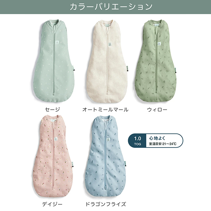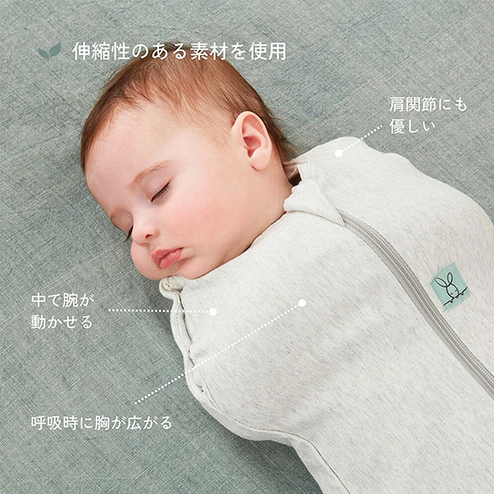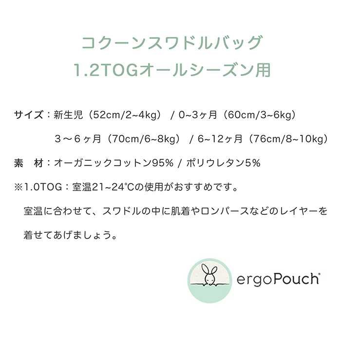 【特徴】赤ちゃんの夜泣き対策に!モロー反射を防いで赤ちゃんもママもぐっすり睡眠!着るおくるみ。 サイズ:新生児(52cm/2-4kg)/0〜3ヶ月(60cm/3-6kg)/ 3〜6ヶ月(70cm/6-8kg)/6〜12ヶ月(76cm/8-10kg) 素 材:オーガニックコットン 95% / ポリウレタン 5% ※1.0TOG:室温21〜24℃の使用がおすすめです。 室温に合わせて、スワドルの中に肌着やロンパースなどのレイヤーを着せてあげましょう。