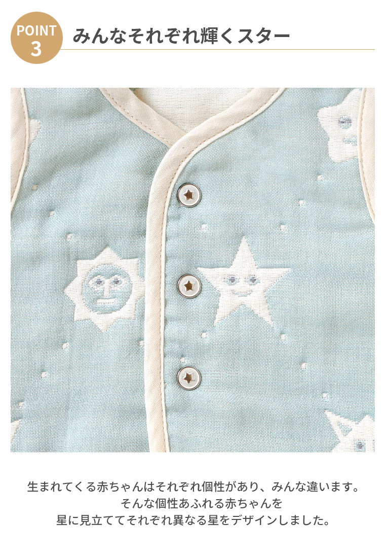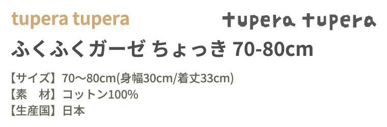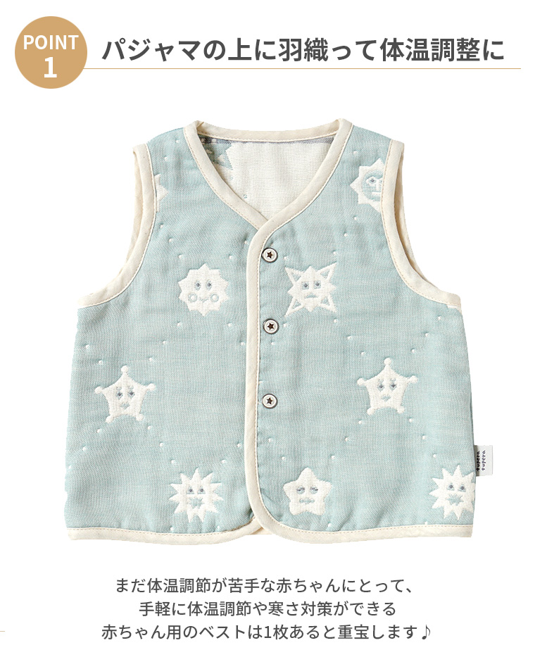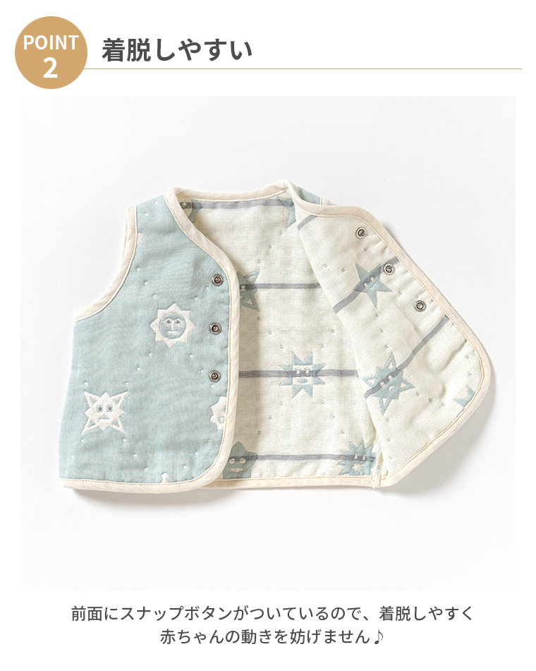 【特徴】まだ体温調節が苦手な赤ちゃんにとって、手軽に体温調節や寒さ対策ができる赤ちゃん用のベストは1枚あると重宝します。6重ガーゼのベビーベストで、柔らかで通気性と保温性を備えています。 【サイズ】70〜80cm(身幅30cm/着丈33cm) 【素 材】コットン100% 【生産国】日本