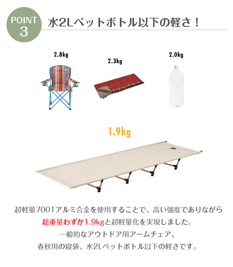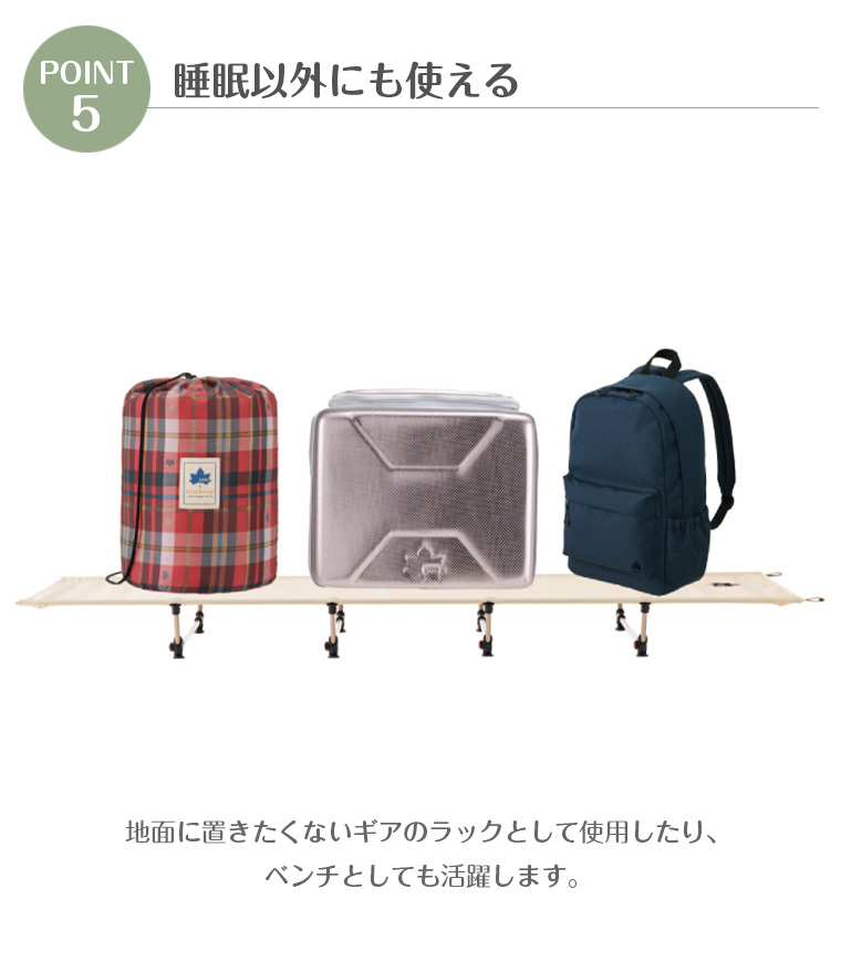 【特徴】ロゴスイージーアッセムプットベッドは新構造フレーム採用により組立てがより簡単になったキャンプベッド。イージーアッセムプットベッドはLOGOSコットシリーズの中でも収納クラス最小&最軽量なので、持っていくアイテムのボリュームと重量をおさえたいソロキャンプやツーリングキャンプの際に最適。